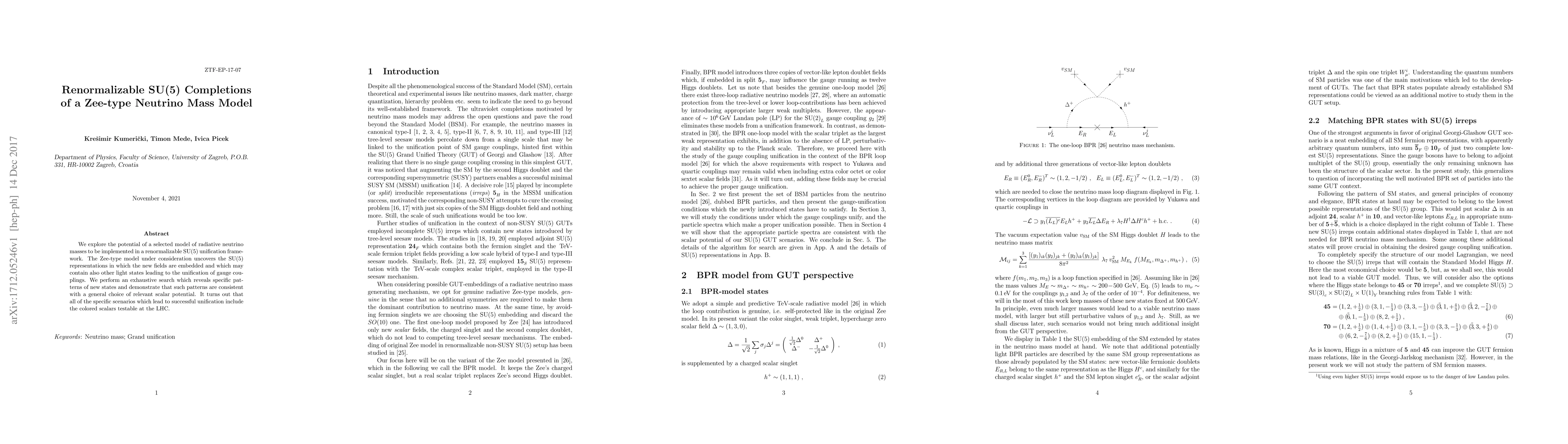 We explore the potential of a selected model of radiative neutrino masses to be implemented in a renormalizable SU(5) unification framework. The Zee-type model under consideration uncovers the SU(5) representations in which the new fields are embedded and which may contain also other light states leading to the unification of gauge couplings. We perform an exhaustive search which reveals specific patterns of new states and demonstrate that such patterns are consistent with a general choice of relevant scalar potential. It turns out that all of the specific scenarios which lead to successful unification include the colored scalars testable at the LHC.