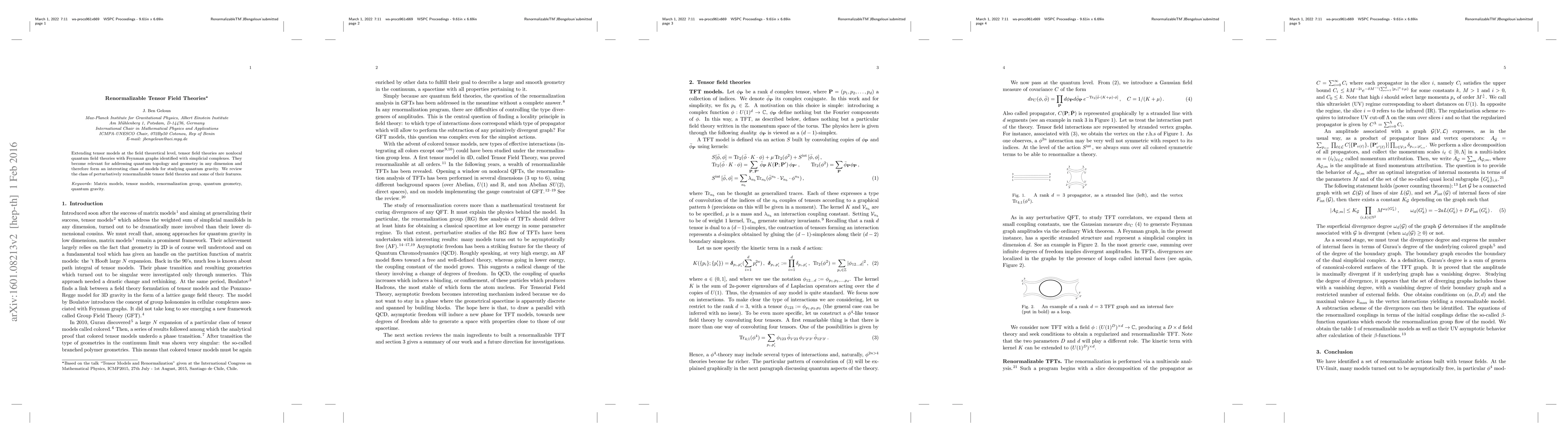 This paper reviews renormalizable tensor field theories, which are nonlocal quantum field theories linked to simplicial complexes, relevant for quantum topology and geometry, and potentially for quantum gravity. The focus is on their perturbative renormalizability and notable features.