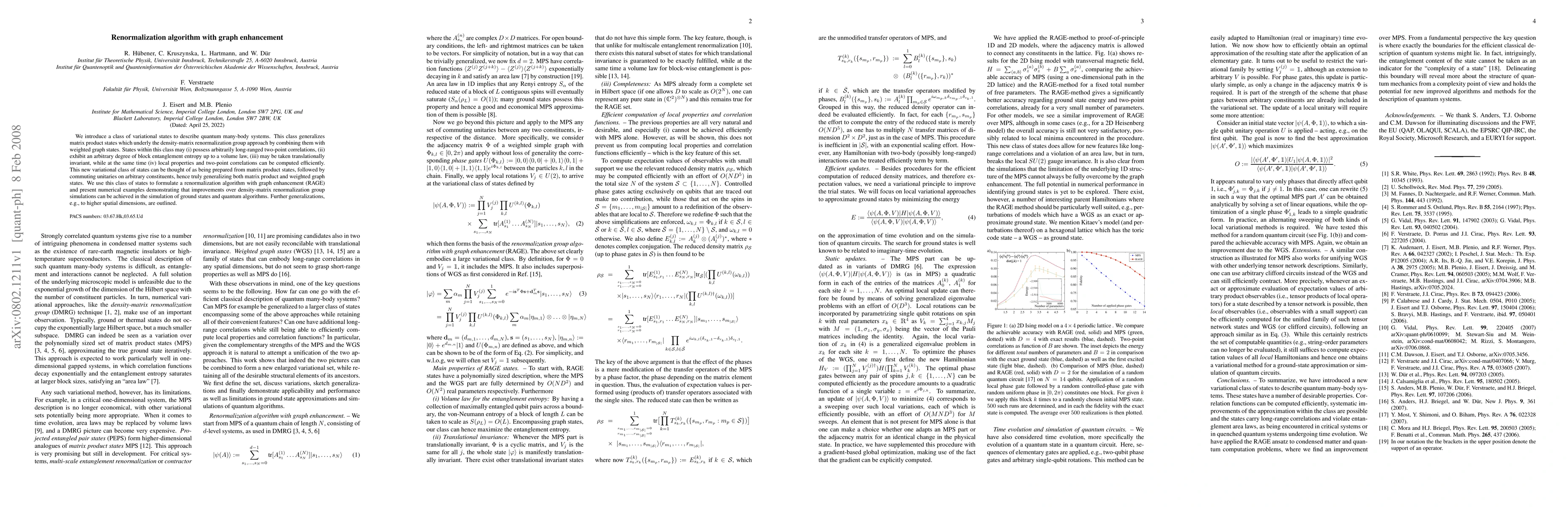 We introduce a class of variational states to describe quantum many-body systems. This class generalizes matrix product states which underly the density-matrix renormalization group approach by combining them with weighted graph states. States within this class may (i) possess arbitrarily long-ranged two-point correlations, (ii) exhibit an arbitrary degree of block entanglement entropy up to a volume law, (iii) may be taken translationally invariant, while at the same time (iv) local properties and two-point correlations can be computed efficiently. This new variational class of states can be thought of as being prepared from matrix product states, followed by commuting unitaries on arbitrary constituents, hence truly generalizing both matrix product and weighted graph states. We use this class of states to formulate a renormalization algorithm with graph enhancement (RAGE) and present numerical examples demonstrating that improvements over density-matrix renormalization group simulations can be achieved in the simulation of ground states and quantum algorithms. Further generalizations, e.g., to higher spatial dimensions, are outlined.