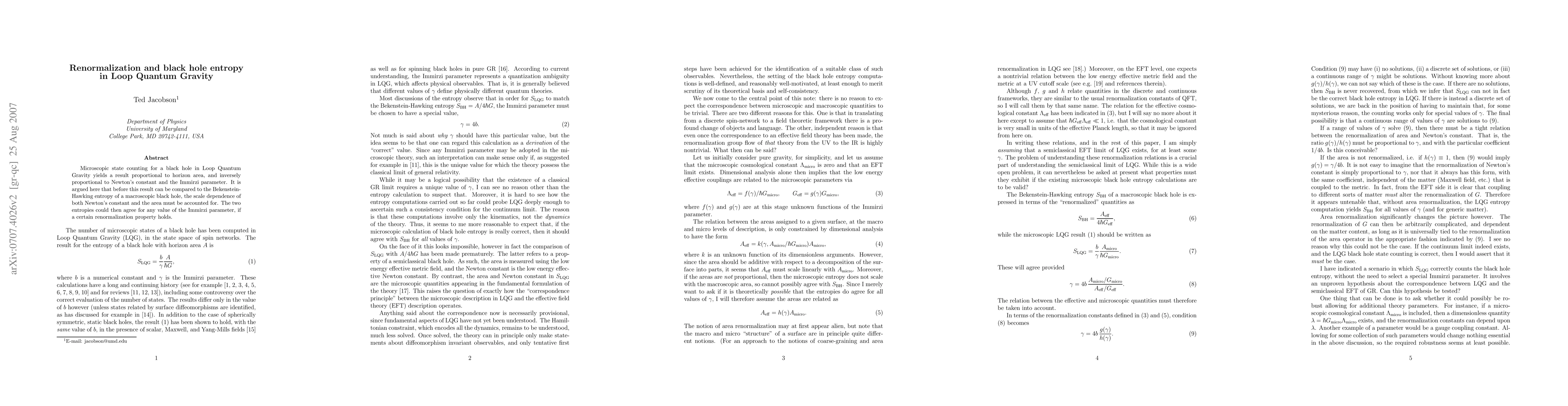 Microscopic state counting for a black hole in Loop Quantum Gravity yields a result proportional to horizon area, and inversely proportional to Newton's constant and the Immirzi parameter. It is argued here that before this result can be compared to the Bekenstein-Hawking entropy of a macroscopic black hole, the scale dependence of both Newton's constant and the area must be accounted for. The two entropies could then agree for any value of the Immirzi parameter, if a certain renormalization property holds.