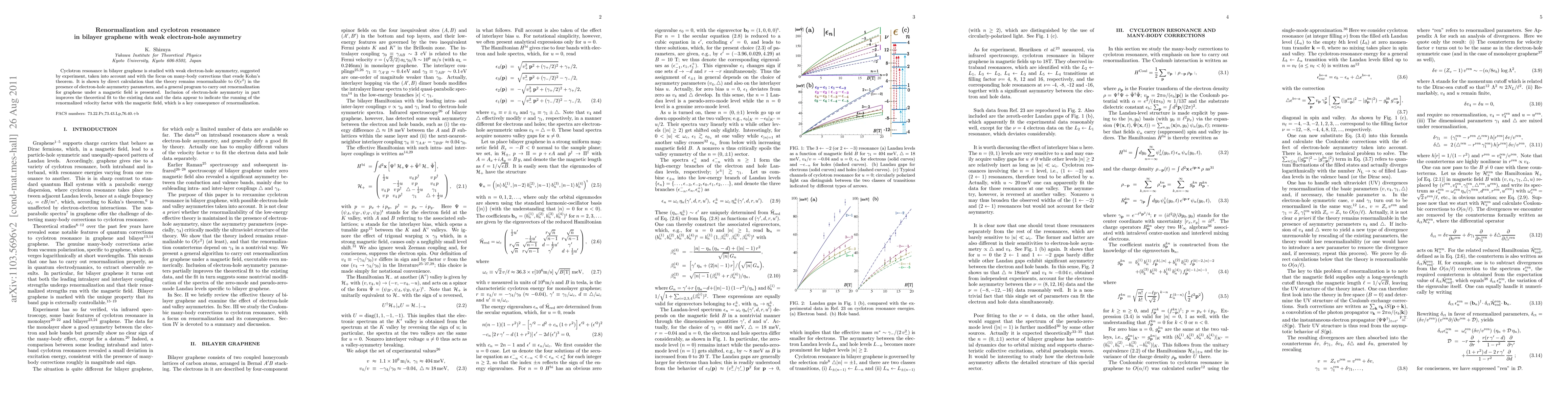 This paper investigates cyclotron resonance in bilayer graphene with a weak electron-hole asymmetry, demonstrating renormalizability up to O(e^2) and presenting a renormalization method for magnetically field-induced graphene. The inclusion of asymmetry enhances theoretical alignment with experimental data, suggesting a magnetic field-dependent renormalized velocity factor.