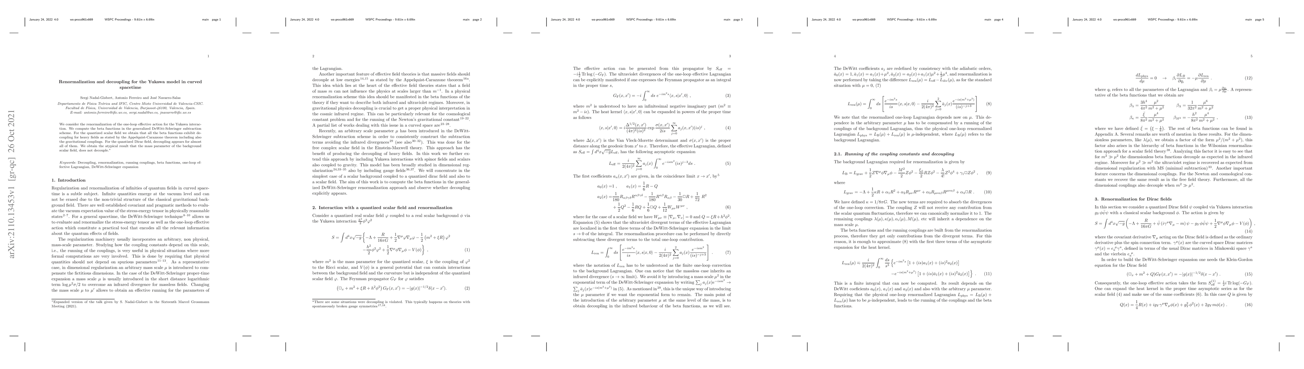 We consider the renormalization of the one-loop effective action for the Yukawa interaction. We compute the beta functions in the generalized DeWitt-Schwinger subtraction scheme. For the quantized scalar field we obtain that all the beta functions exhibit decoupling for heavy fields as stated by the Appelquist-Carazzone theorem including also the gravitational couplings. For the quantized Dirac field, decoupling appears for almost all of them. We obtain the atypical result that the mass parameter of the background scalar field does not decouple.