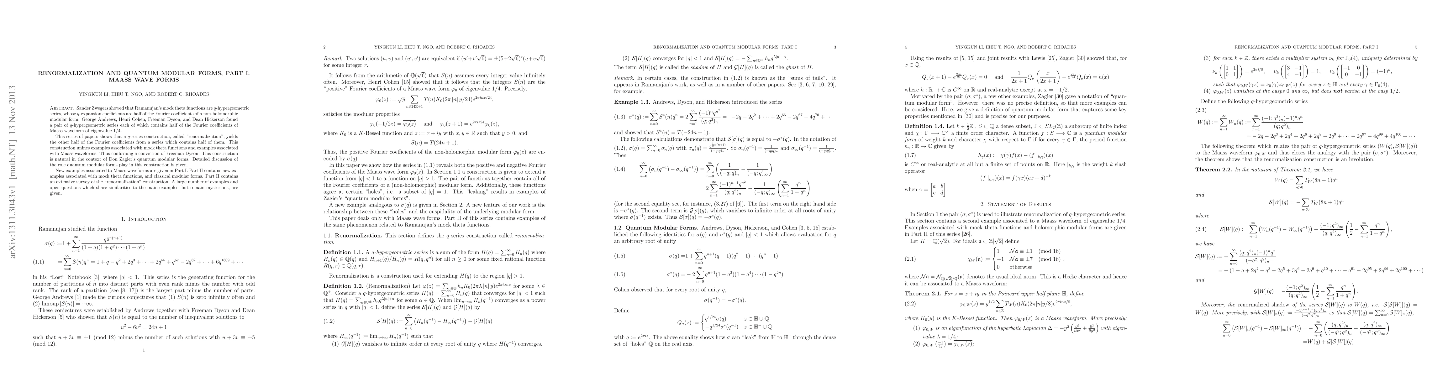 Sander Zwegers showed that Ramanujan's mock theta functions are $q$-hypergeometric series, whose $q$-expansion coefficients are half of the Fourier coefficients of a non-holomorphic modular form. George Andrews, Henri Cohen, Freeman Dyson, and Dean Hickerson found a pair of $q$-hypergeometric series each of which contains half of the Fourier coefficients of Maass waveform of eigenvalue $1/4$. This series of papers shows that a $q$-series construction, called ``renormalization'', yields the other half of the Fourier coefficients from a series which contains half of them. This construction unifies examples associated with mock theta functions and examples associated with Maass waveforms. Thus confirming a conviction of Freeman Dyson. This construction is natural in the context of Don Zagier's quantum modular forms. Detailed discussion of the role quantum modular forms play in this construction is given. New examples associated to Maass waveforms are given in Part I. Part II contains new examples associated with mock theta functions, and classical modular forms. Part II contains an extensive survey of the ``renormalization'' construction. A large number of examples and open questions which share similarities to the main examples, but remain mysterious, are given.