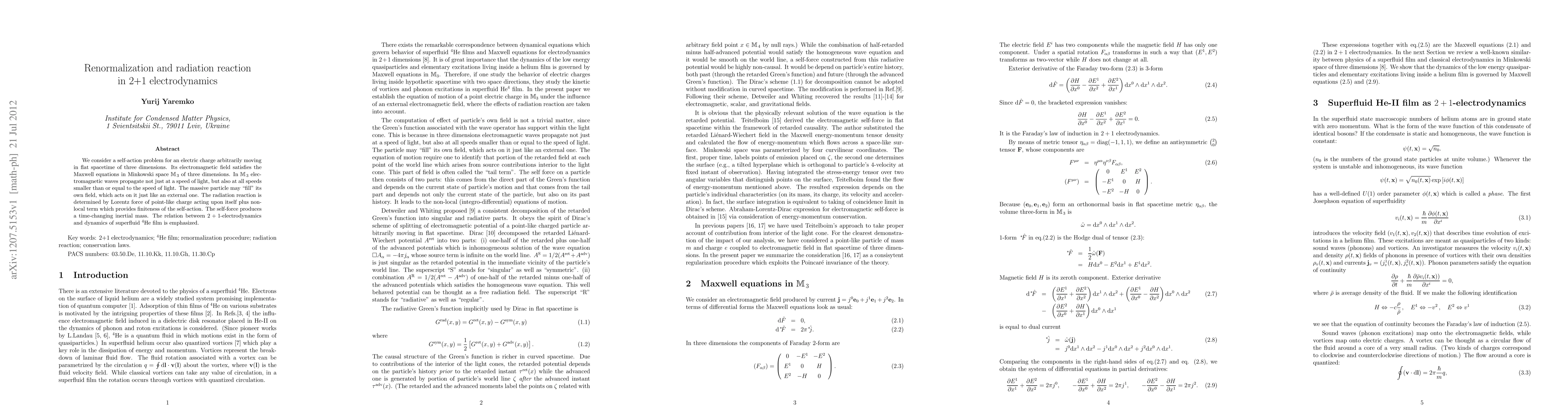 We consider a self-action problem for an electric charge arbitrarily moving in flat spacetime of three dimensions. Its electromagnetic field satisfies the Maxwell equations in Minkowski space of three dimensions. In this space electromagnetic waves propagate not just at a speed of light, but also at all speeds smaller than or equal to the speed of light. The massive particle may "fill" its own field, which acts on it just like an external one. The radiation reaction is determined by Lorentz force of point-like charge acting upon itself plus non-local term which provides finiteness of the self-action. The self-force produces a time-changing inertial mass. The relation between (2+1)-electrodynamics and dynamics of superfluid 4He film is emphasized.