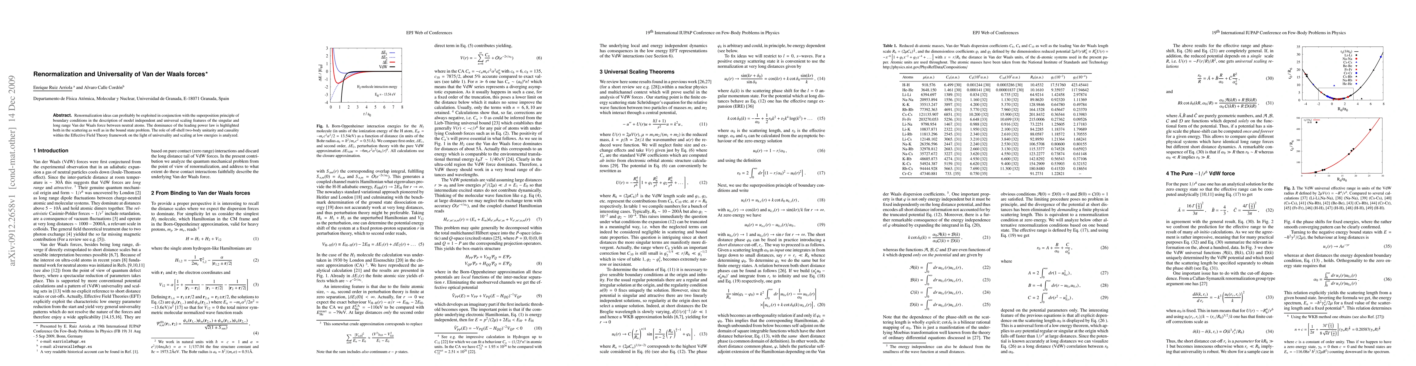 This paper explores the application of renormalization techniques to describe the universal scaling features of Van der Waals forces, emphasizing the leading power law's dominance in scattering and bound states. It also examines the role of unitarity and causality within Effective Field Theory to understand these forces' universality at low energies.