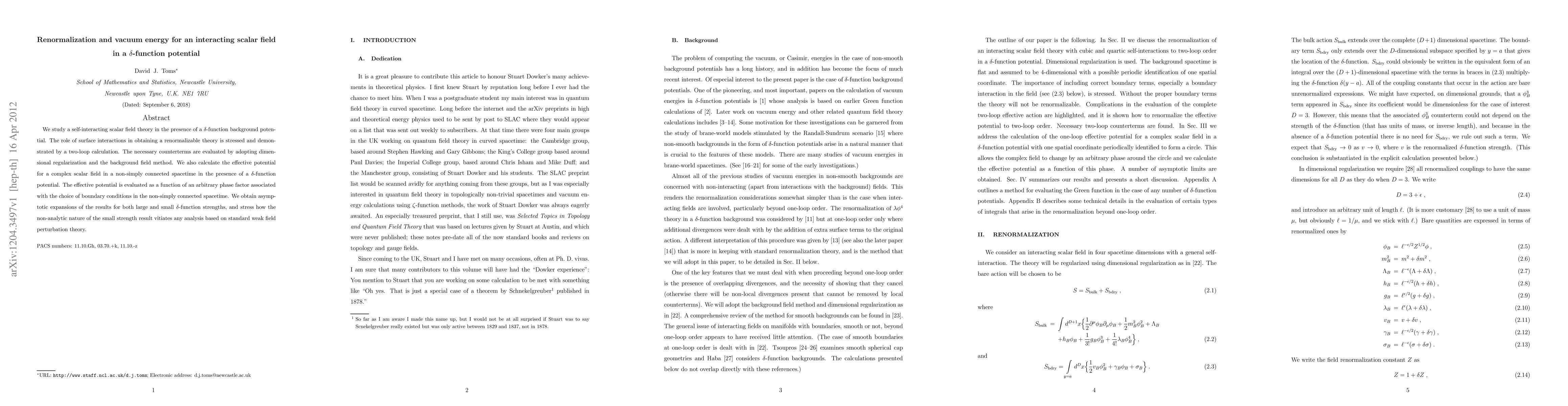 We study a self-interacting scalar field theory in the presence of a \delta-function background potential. The role of surface interactions in obtaining a renormalizable theory is stressed and demonstrated by a two-loop calculation. The necessary counterterms are evaluated by adopting dimensional regularization and the background field method. We also calculate the effective potential for a complex scalar field in a non-simply connected spacetime in the presence of a \delta-function potential. The effective potential is evaluated as a function of an arbitrary phase factor associated with the choice of boundary conditions in the non-simply connected spacetime. We obtain asymptotic expansions of the results for both large and small \delta-function strengths, and stress how the non-analytic nature of the small strength result vitiates any analysis based on standard weak field perturbation theory.