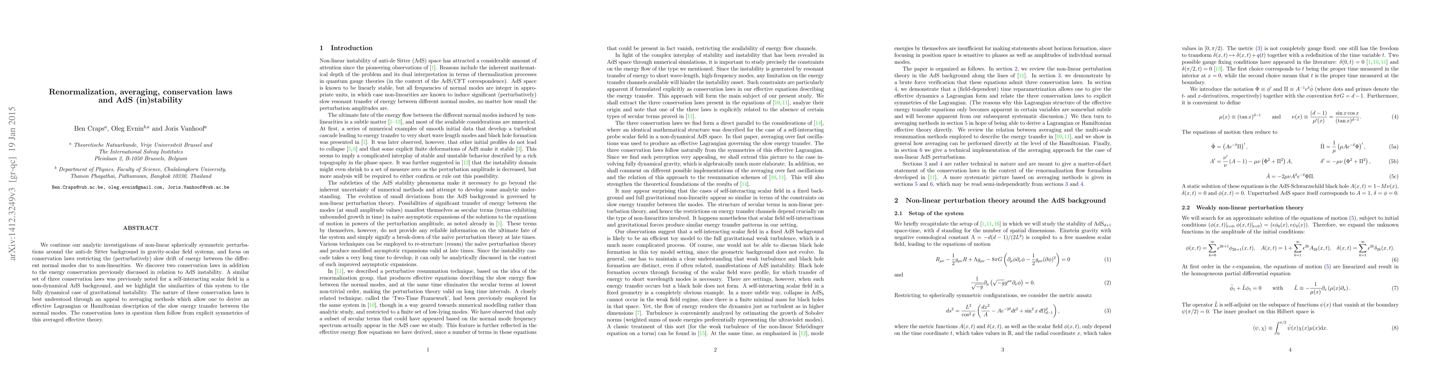 We continue our analytic investigations of non-linear spherically symmetric perturbations around the anti-de Sitter background in gravity-scalar field systems, and focus on conservation laws restricting the (perturbatively) slow drift of energy between the different normal modes due to non-linearities. We discover two conservation laws in addition to the energy conservation previously discussed in relation to AdS instability. A similar set of three conservation laws was previously noted for a self-interacting scalar field in a non-dynamical AdS background, and we highlight the similarities of this system to the fully dynamical case of gravitational instability. The nature of these conservation laws is best understood through an appeal to averaging methods which allow one to derive an effective Lagrangian or Hamiltonian description of the slow energy transfer between the normal modes. The conservation laws in question then follow from explicit symmetries of this averaged effective theory.