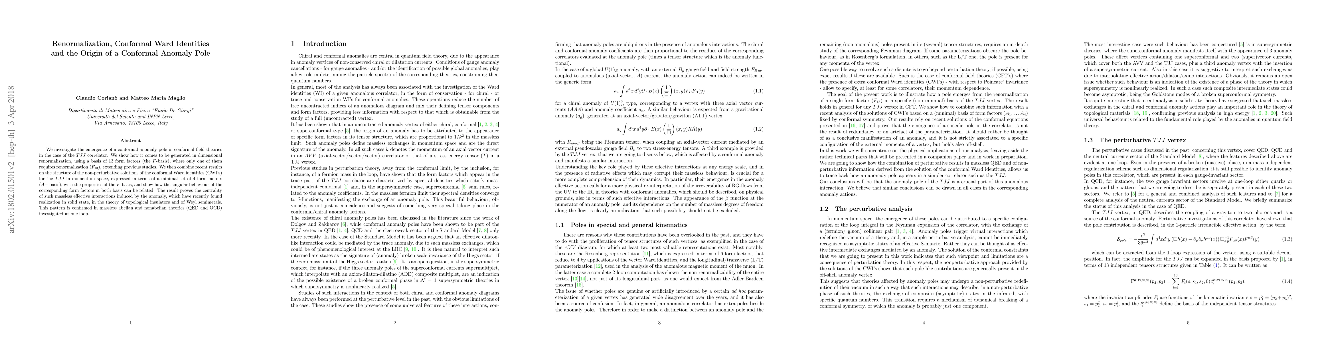 This paper explores the emergence of a conformal anomaly pole in conformal field theories through dimensional renormalization, focusing on the $TJJ$ correlator. It reveals that only one of the 13 form factors in the $F$-basis requires renormalization, and connects this to the non-perturbative solutions of conformal Ward identities in the $A$-basis, demonstrating the significance of massless effective interactions in topological insulators and Weyl semimetals.
