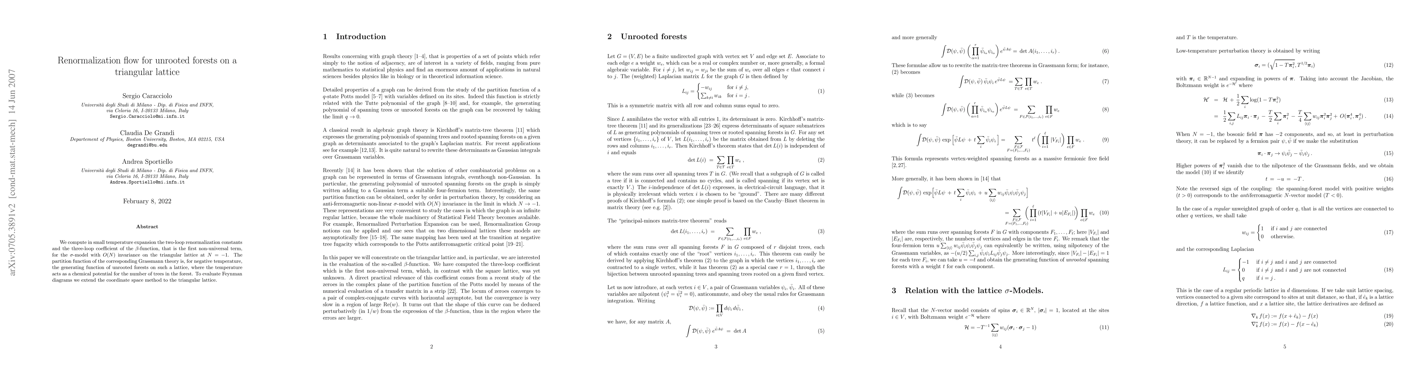 Researchers used a mathematical technique called renormalization flow to study unrooted forests on a triangular lattice. They found key constants that describe the behavior of these forests at low temperatures.