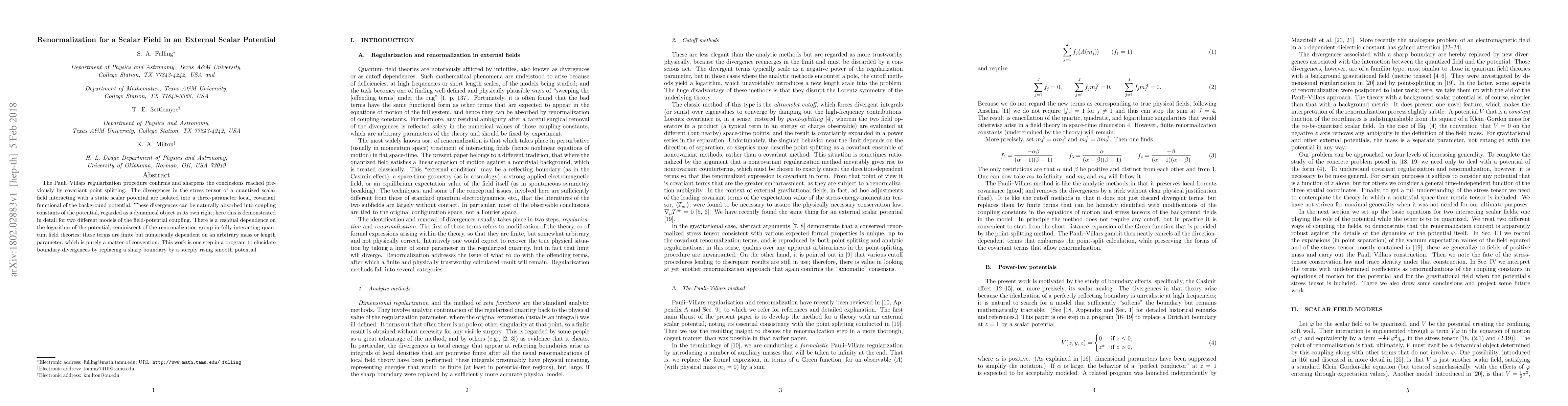 The Pauli--Villars regularization procedure confirms and sharpens the conclusions reached previously by covariant point splitting. The divergences in the stress tensor of a quantized scalar field interacting with a static scalar potential are isolated into a three-parameter local, covariant functional of the background potential. These divergences can be naturally absorbed into coupling constants of the potential, regarded as a dynamical object in its own right; here this is demonstrated in detail for two different models of the field-potential coupling. here is a residual dependence on the logarithm of the potential, reminiscent of the renormalization group in fully interacting quantum field theories; these terms are finite but numerically dependent on an arbitrary mass or length parameter, which is purely a matter of convention. This work is one step in a program to elucidate boundary divergences by replacing a sharp boundary by a steeply rising smooth potential.