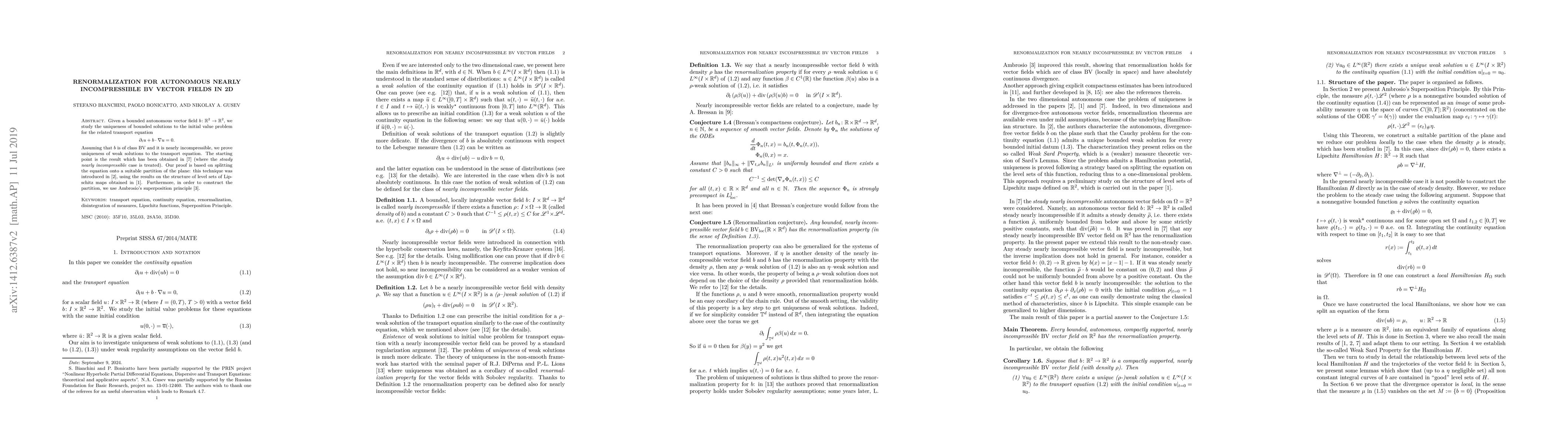 Researchers prove uniqueness of weak solutions to a transport equation in 2D space for nearly incompressible bounded BV vector fields, using partitioning and Ambrosio's superposition principle.