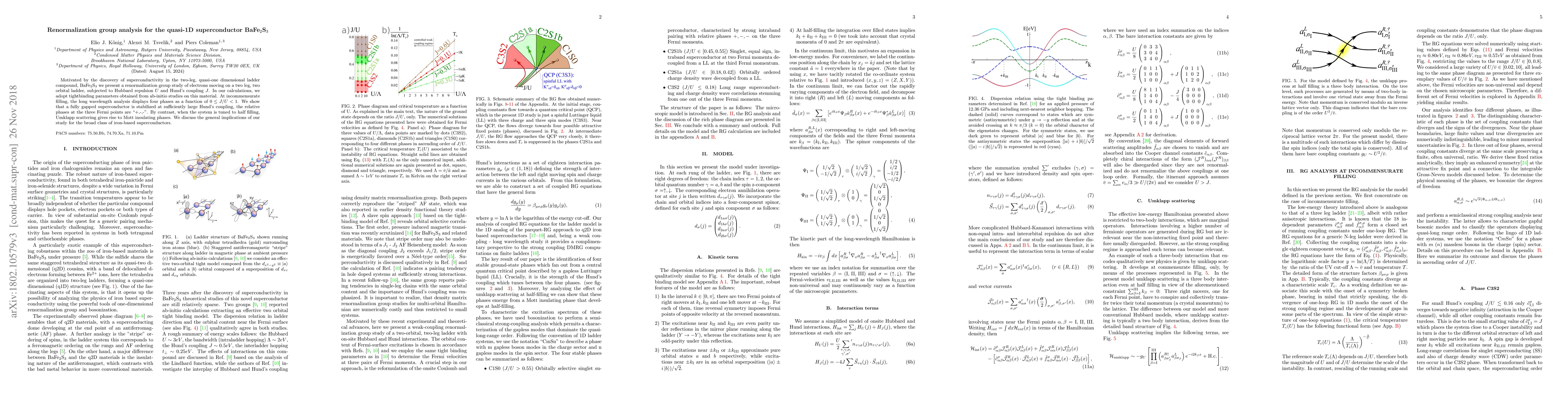 Motivated by the discovery of superconductivity in the two-leg, quasi-one dimensional ladder compound, BaFe$_2$S$_3$ we present a renormalization group study of electrons moving on a two leg, two orbital ladder, subjected to Hubbard repulsion $U$ and Hund's coupling $J$. In our calculations, we adopt tightbinding parameters obtained from ab-initio studies on this material. At incommensurate filling, the long wavelength analysis displays four phases as a function of $0 \leq J/U <1$. We show that a fully gapped superconductor is stabilized at sufficiently large Hund's coupling, the relative phases at the three Fermi points are "+,-,-". By contrast, when the system is tuned to half filling, Umklapp scattering gives rise to Mott insulating phases. We discuss the general implications of our study for the broad class of iron-based superconductors.