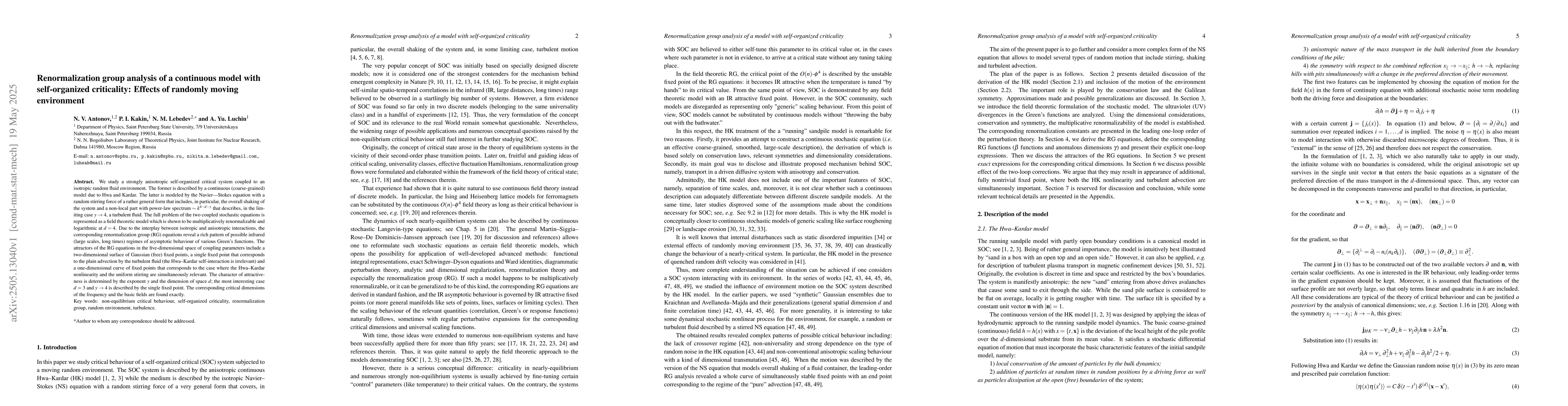 The research employs a renormalization group (RG) analysis of a continuous model with self-organized criticality, coupled to an isotropic random fluid environment. The model incorporates a strongly anisotropic system described by Hwa and Kardar, and an isotropic random fluid modeled by the Navier--Stokes equation with a random stirring force.