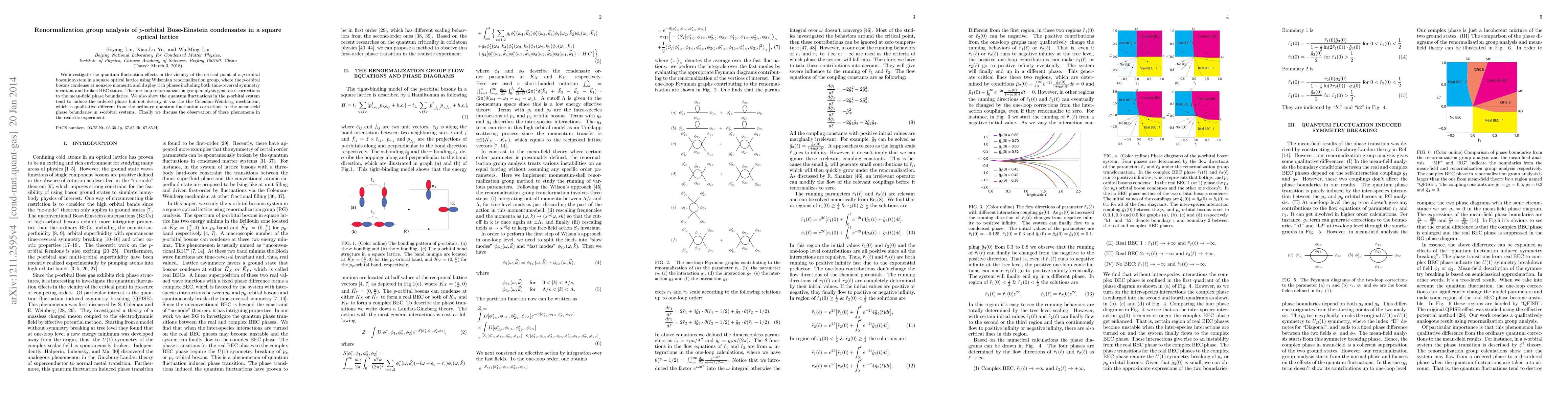 We investigate the quantum fluctuation effects in the vicinity of the critical point of a $p$-orbital bosonic system in a square optical lattice using Wilsonian renormalization group, where the $p$-orbital bosons condense at nonzero momenta and display rich phases including both time-reversal symmetry invariant and broken BEC states. The one-loop renormalization group analysis generates corrections to the mean-field phase boundaries. We also show the quantum fluctuations in the $p$-orbital system tend to induce the ordered phase but not destroy it via the the Coleman-Weinberg mechanism, which is qualitative different from the ordinary quantum fluctuation corrections to the mean-field phase boundaries in $s$-orbital systems. Finally we discuss the observation of these phenomena in the realistic experiment.