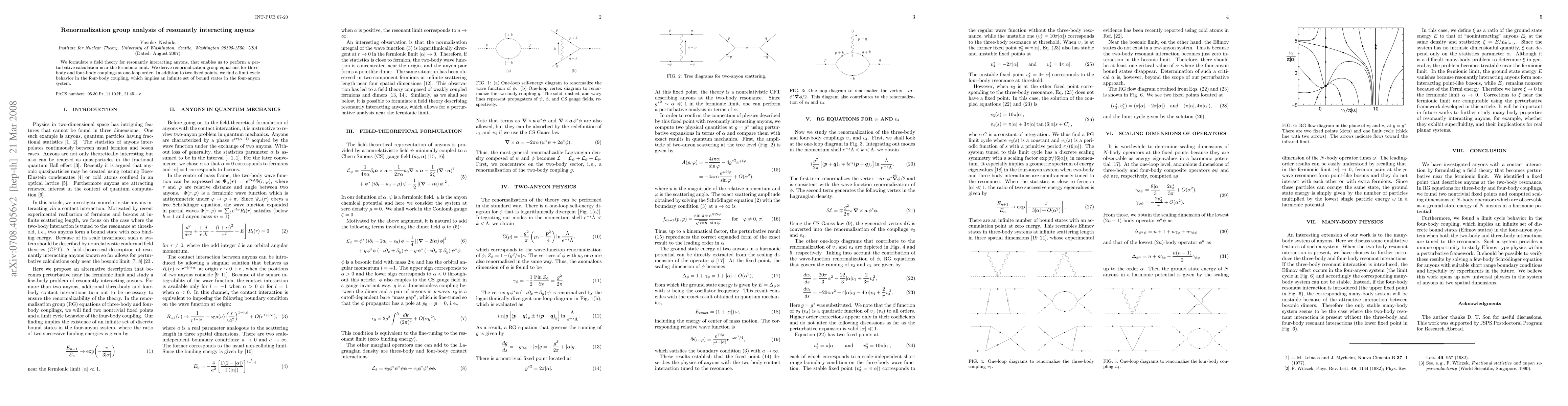 We formulate a field theory for resonantly interacting anyons, that enables us to perform a perturbative calculation near the fermionic limit. We derive renormalization group equations for three-body and four-body couplings at one-loop order. In addition to two fixed points, we find a limit cycle behavior in the four-body coupling, which implies an infinite set of bound states in the four-anyon system.