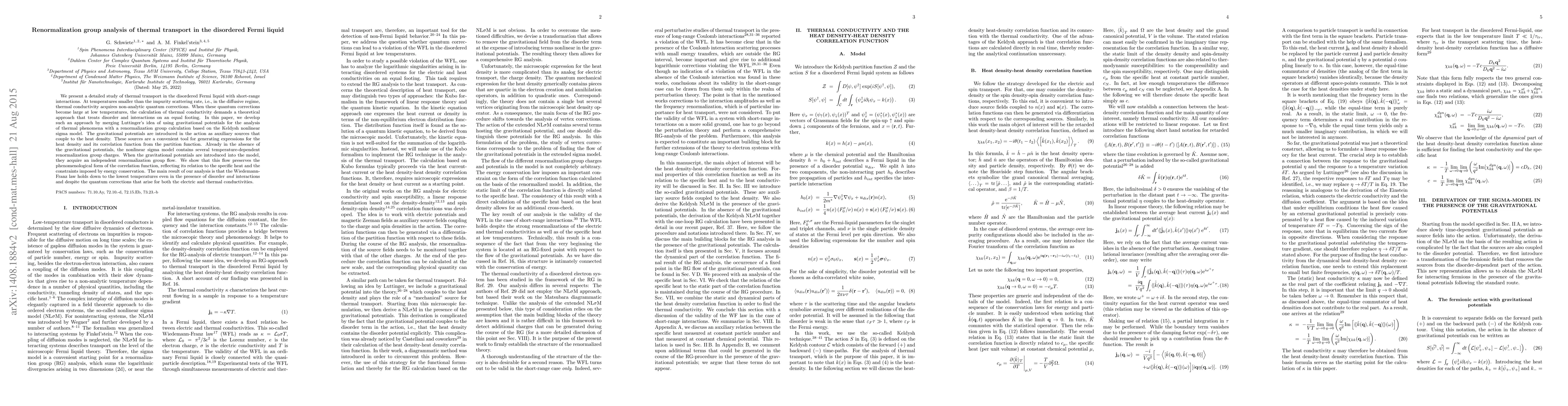 This paper develops a renormalization group approach to study thermal transport in disordered Fermi liquids, merging Luttinger's gravitational potentials with the Keldysh nonlinear sigma model. The analysis reveals that the Wiedemann-Franz law remains valid at low temperatures despite the presence of quantum corrections due to disorder and interactions.