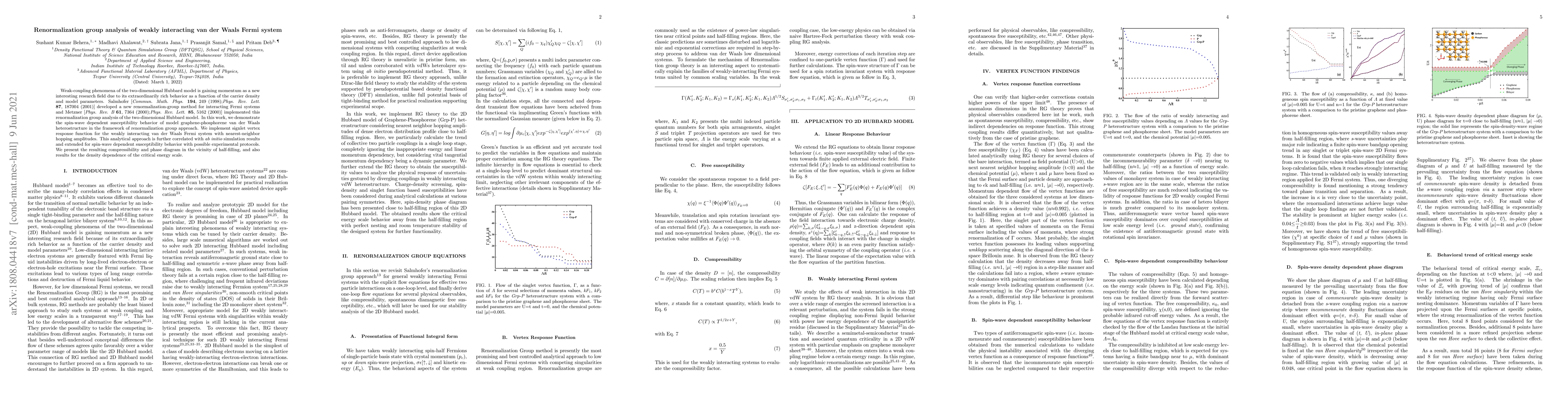 Weak-coupling phenomena of the two-dimensional Hubbard model is gaining momentum as a new interesting research field due to its extraordinarily rich behavior as a function of the carrier density and model parameters. Salmhofer [{\it Commun. Math. Phys}. \textbf{194}, 249 (1998);{\it Phys. Rev. Lett}. {\bf 87}, 187004 (2001)] developed a new renormalization-group method for interacting Fermi systems and Metzner [{\it Phys. Rev. B} {\bf 61}, 7364 (2000);{\it Phys. Rev. Lett}. {\bf 85}, 5162 (2000)] implemented this renormalization group analysis of the two-dimensional Hubbard model. In this work, we demonstrate the spin-wave dependent susceptibility behavior of model graphene-phosphorene van der Waals heterostructure in the framework of renormalization group approach. We implement signlet vertex response function for the weakly interacting van der Waals Fermi system with nearest-neighbor hopping amplitudes. This analytical approach is further correlated with {\it ab initio} simulation results and extended for spin-wave dependent susceptibility behavior with possible experimental protocols. We present the resulting compressibility and phase diagram in the vicinity of half-filling, and also results for the density dependence of the critical energy scale.