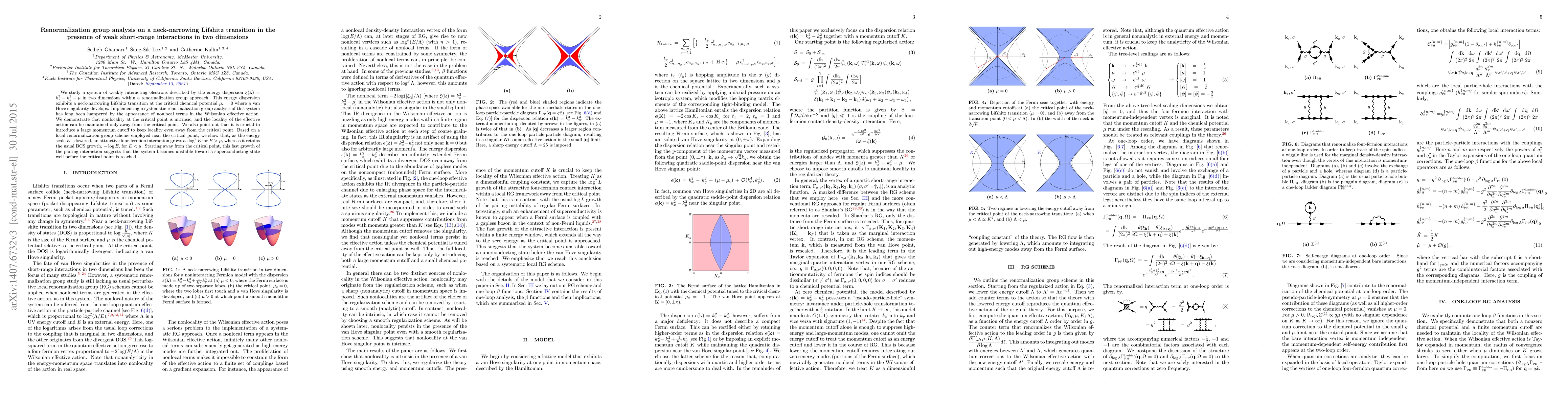 We study a system of weakly interacting electrons described by the energy dispersion $\xi(\mathbf{k}) = k_x^2 - k_y^2 - \mu$ in two dimensions within a renormalization group approach. This energy dispersion exhibits a neck-narrowing Lifshitz transition at the critical chemical potential $\mu_c=0$ where a van Hove singularity develops. Implementing a systematic renormalization group analysis of this system has long been hampered by the appearance of nonlocal terms in the Wilsonian effective action. We demonstrate that non-locality at the critical point is intrinsic, and the locality of the effective action can be maintained only away from the critical point. We also point out that it is crucial to introduce a large momentum cutoff to keep locality even away from the critical point. Based on a local renormalization group scheme employed near the critical point, we show that, as the energy scale $E$ is lowered, an attractive four-fermion interaction grows as $\log^2 E$ for $E > \mu$, whereas it retains the usual BCS growth, $-\log E$, for $E < \mu$. Starting away from the critical point, this fast growth of the pairing interaction suggests that the system becomes unstable toward a superconducting state well before the critical point is reached.