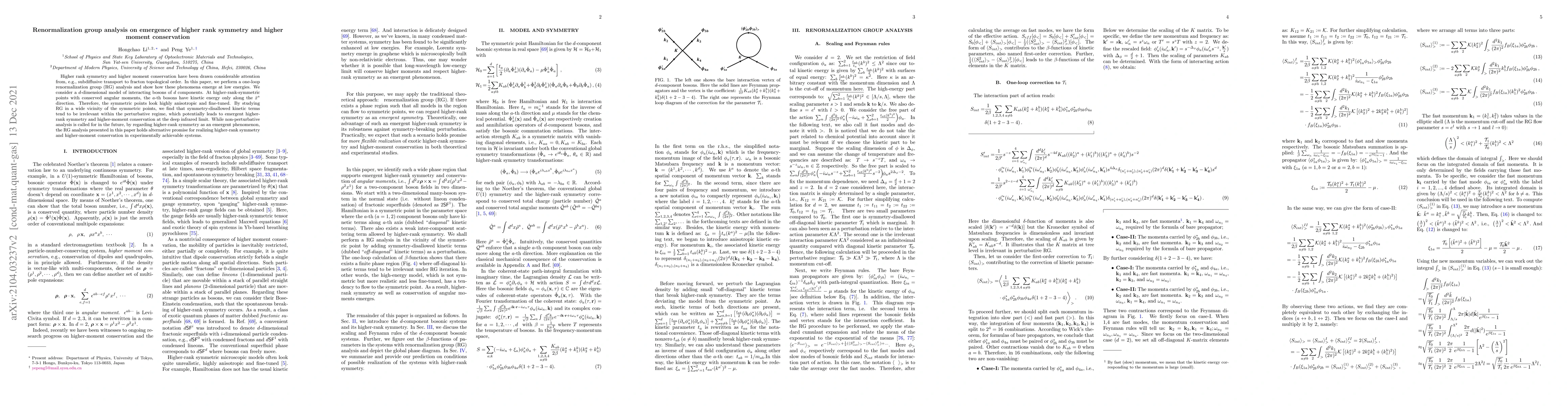 Higher rank symmetry and higher moment conservation have been drawn considerable attention from, e.g., subdiffusive transport to fracton topological order. In this paper, we perform a one-loop renormalization group (RG) analysis and show how these phenomena emerge at low energies. We consider a $d$-dimensional model of interacting bosons of d components. At higher-rank-symmetric points with conserved angular moments, the $a$-th bosons have kinetic energy only along the $x^a$ direction. Therefore, the symmetric points look highly anisotropic and fine-tuned. By studying RG in a wide vicinity of the symmetric points, we find that symmetry-disallowed kinetic terms tend to be irrelevant within the perturbative regime, which potentially leads to emergent higher-rank symmetry and higher-moment conservation at the deep infrared limit. While non-perturbative analysis is called for in the future, by regarding higher-rank symmetry as an emergent phenomenon, the RG analysis presented in this paper holds alternative promise for realizing higher-rank symmetry and higher-moment conservation in experimentally achievable systems.