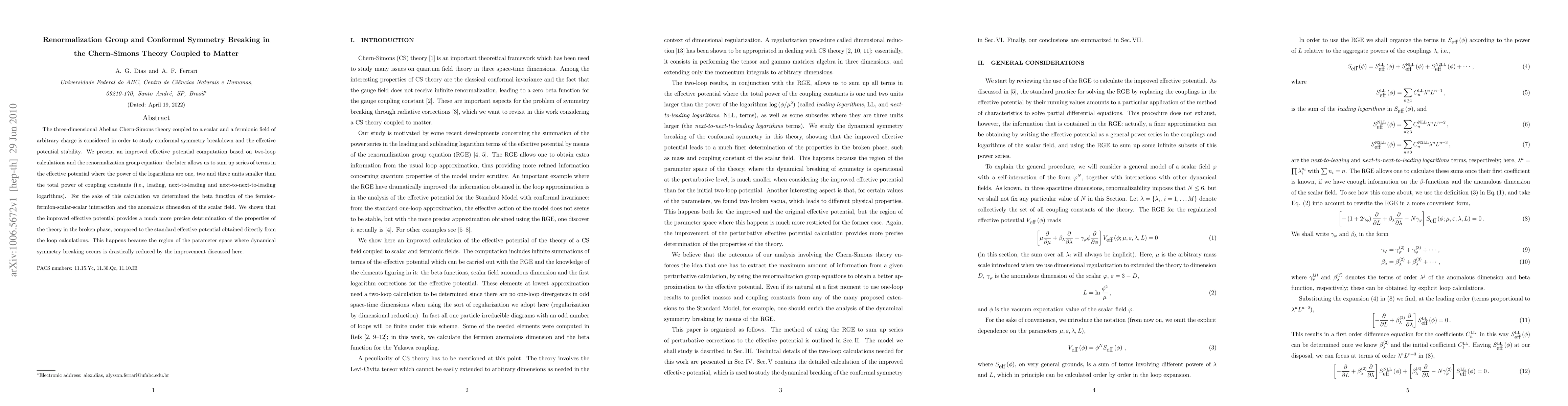 This paper studies the conformal symmetry breakdown in three-dimensional Abelian Chern-Simons theory coupled to matter, employing improved effective potential calculations based on two-loop renormalization group methods. The results show a more precise determination of the broken phase properties, significantly reducing the parameter space where symmetry breaking occurs.