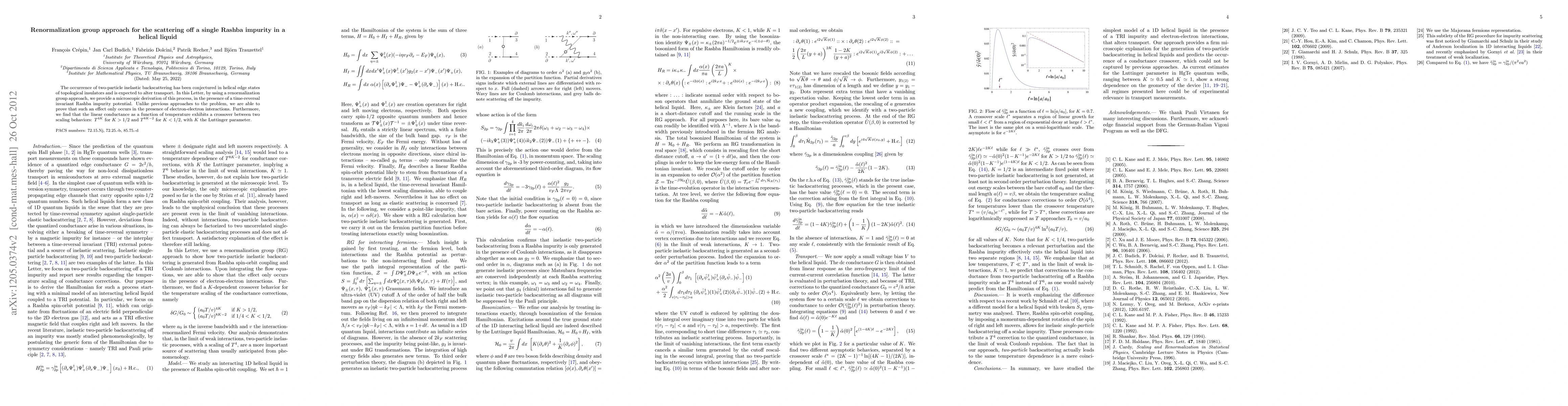 The occurrence of two-particle inelastic backscattering has been conjectured in helical edge states of topological insulators and is expected to alter transport. In this Letter, by using a renormalization group approach, we provide a microscopic derivation of this process, in the presence of a time-reversal invariant Rashba impurity potential. Unlike previous approaches to the problem, we are able to prove that such an effect only occurs in the presence of electron-electron interactions. Furthermore, we find that the linear conductance as a function of temperature exhibits a crossover between two scaling behaviors: $T^{4K}$ for $K>1/2$ and $T^{8K-2}$ for $K<1/2$, with $K$ the Luttinger parameter.