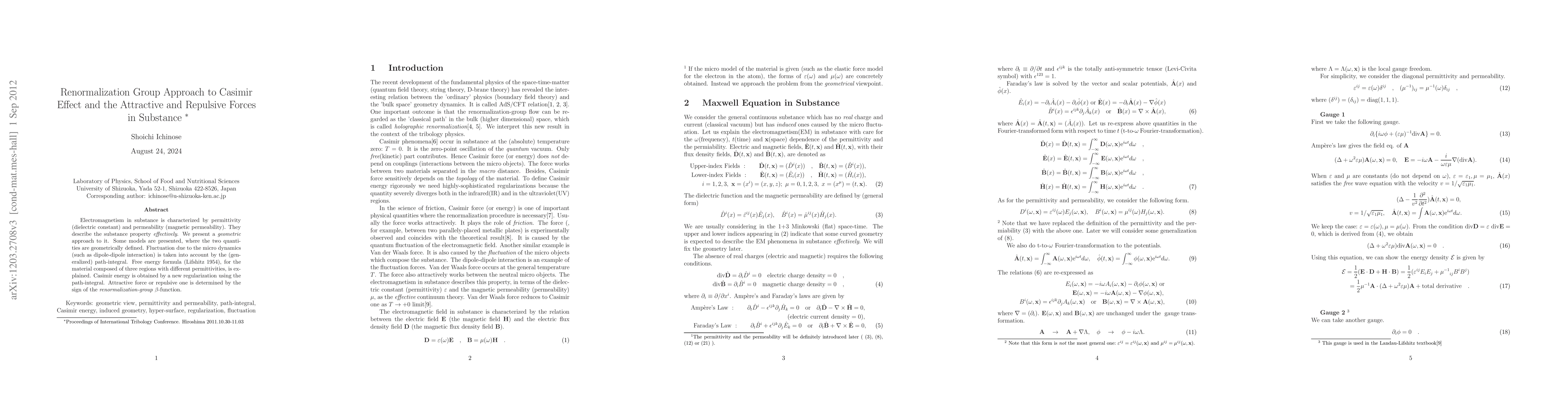 Electromagnetism in substance is characterized by permittivity (dielectric constant) and permeability (magnetic permeability). They describe the substance property {\it effectively}. We present a {\it geometric} approach to it. Some models are presented, where the two quantities are geometrically defined. Fluctuation due to the micro dynamics (such as dipole-dipole interaction) is taken into account by the (generalized) path-integral. Free energy formula (Lifshitz 1954), for the material composed of three regions with different permittivities, is explained. Casimir energy is obtained by a new regularization using the path-integral. Attractive force or repulsive one is determined by the sign of the {\it renormalization-group} $\beta$-function.