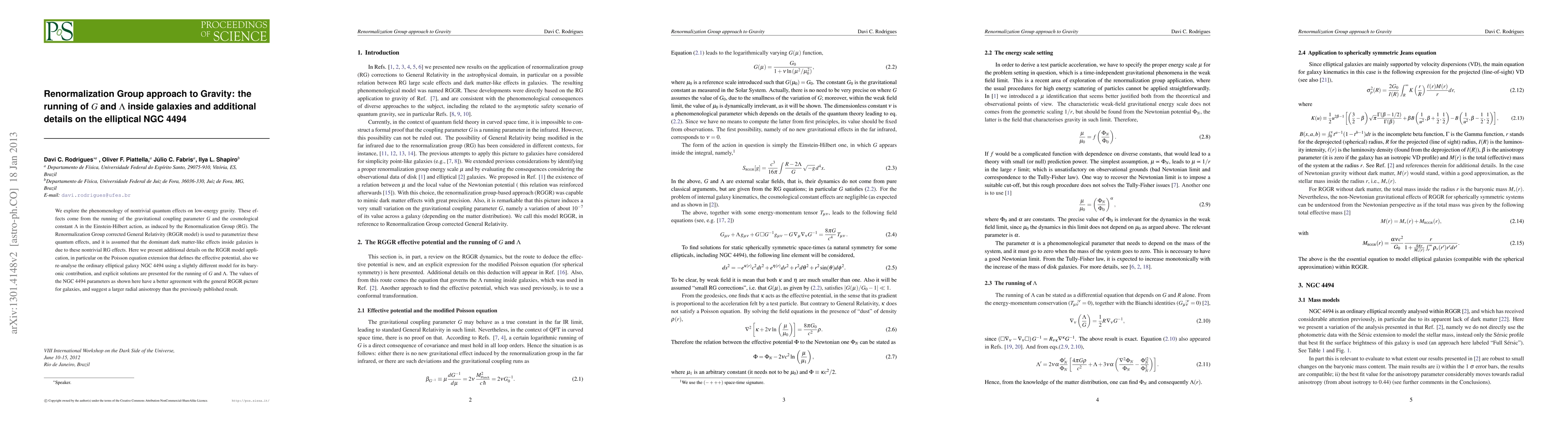 We explore the phenomenology of nontrivial quantum effects on low-energy gravity. These effects come from the running of the gravitational coupling parameter G and the cosmological constant L in the Einstein-Hilbert action, as induced by the Renormalization Group (RG). The Renormalization Group corrected General Relativity (RGGR model) is used to parametrize these quantum effects, and it is assumed that the dominant dark matter-like effects inside galaxies is due to these nontrivial RG effects. Here we present additional details on the RGGR model application, in particular on the Poisson equation extension that defines the effective potential, also we re-analyse the ordinary elliptical galaxy NGC 4494 using a slightly different model for its baryonic contribution, and explicit solutions are presented for the running of G and L. The values of the NGC 4494 parameters as shown here have a better agreement with the general RGGR picture for galaxies, and suggest a larger radial anisotropy than the previously published result.