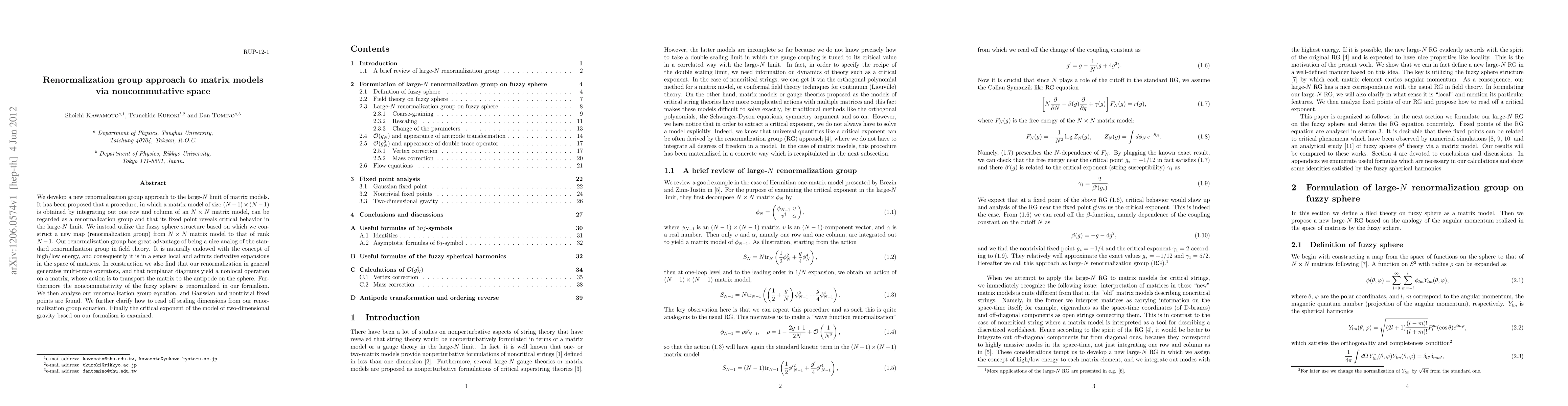 This paper develops a novel renormalization group approach for matrix models based on the fuzzy sphere, showing its equivalence to standard field theory renormalization. The method reveals critical behavior and scaling dimensions, and examines the critical exponent for two-dimensional gravity models.