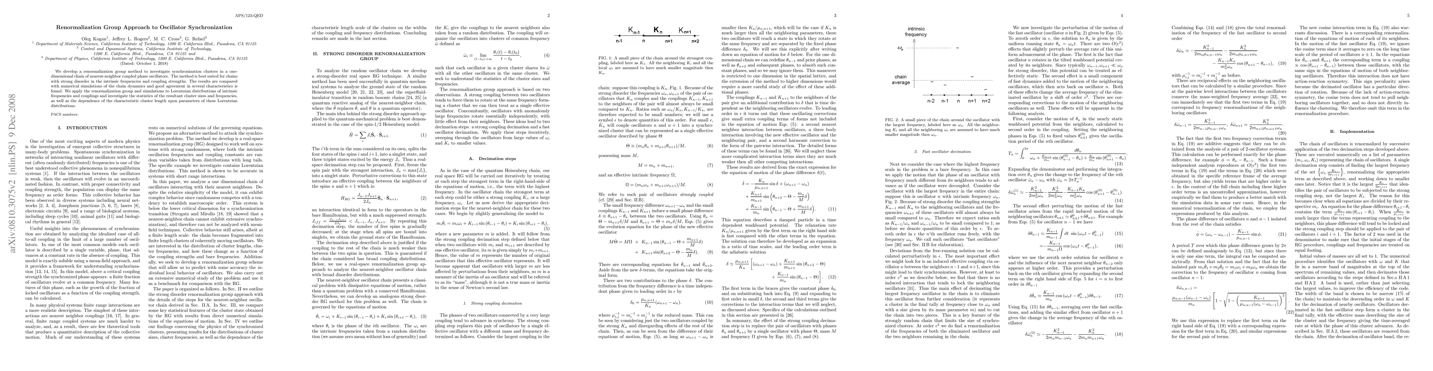 The paper introduces a renormalization group approach to study synchronization clusters in disordered phase oscillators. It finds good agreement between the method and numerical simulations, and analyzes the statistical properties of cluster sizes and frequencies in Lorentzian distributions.