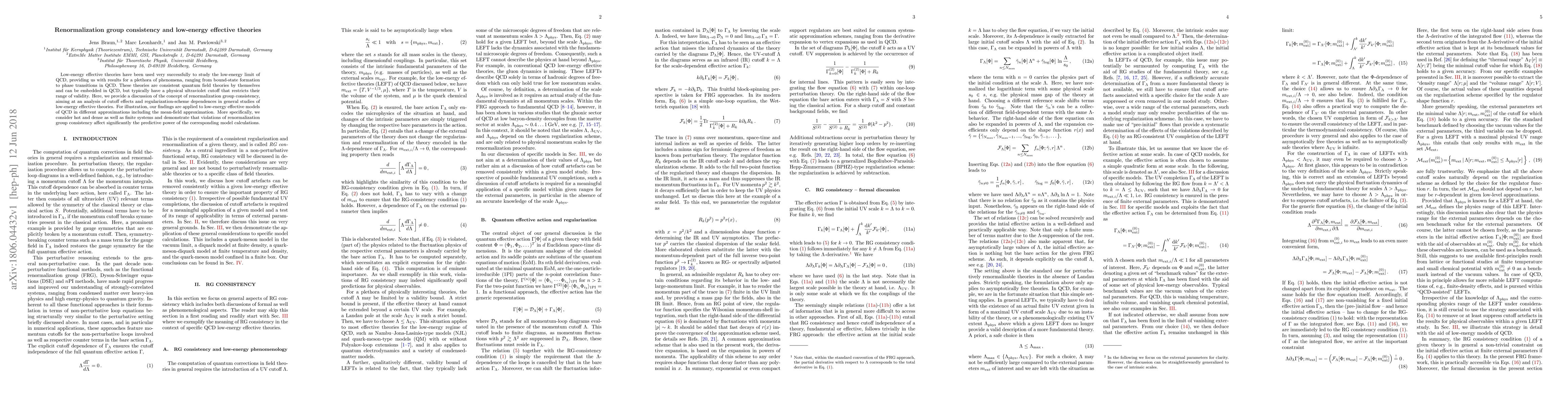 This paper explores the concept of renormalization group consistency in low-energy effective theories for QCD, analyzing cutoff effects and regularization-scheme dependences. It demonstrates that violations of this consistency can significantly impact the predictive power of model calculations for phenomena ranging from bound states to phase transitions in QCD.