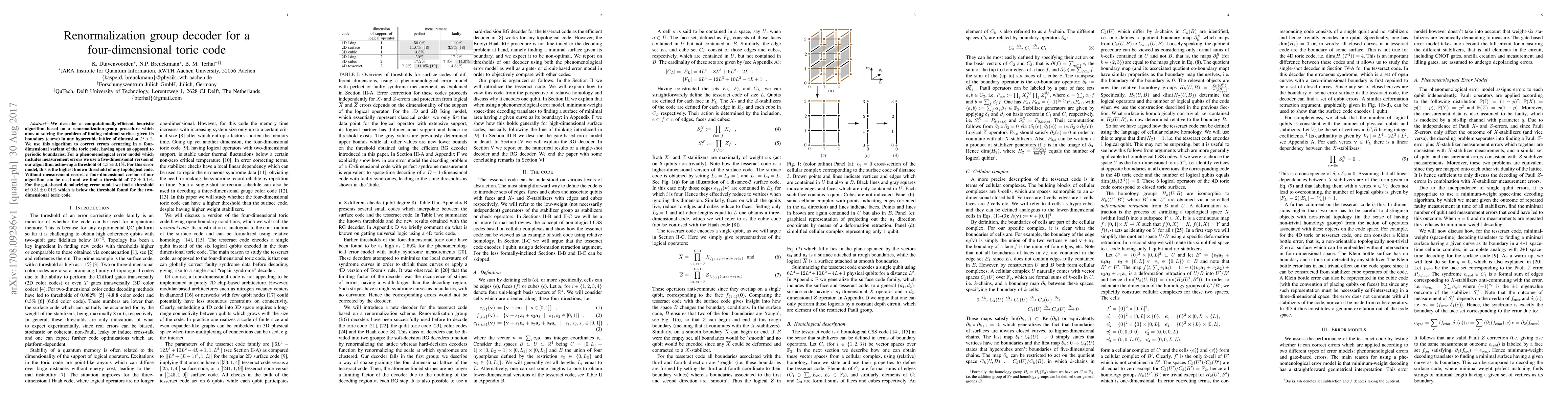 This paper presents a renormalization-group decoder for a four-dimensional toric code, achieving high error correction thresholds under various error models, including a phenomenological model with a threshold of $4.35\pm0.1\%$ and a gate-based depolarizing model with a threshold of $0.31\pm0.01\%$.
