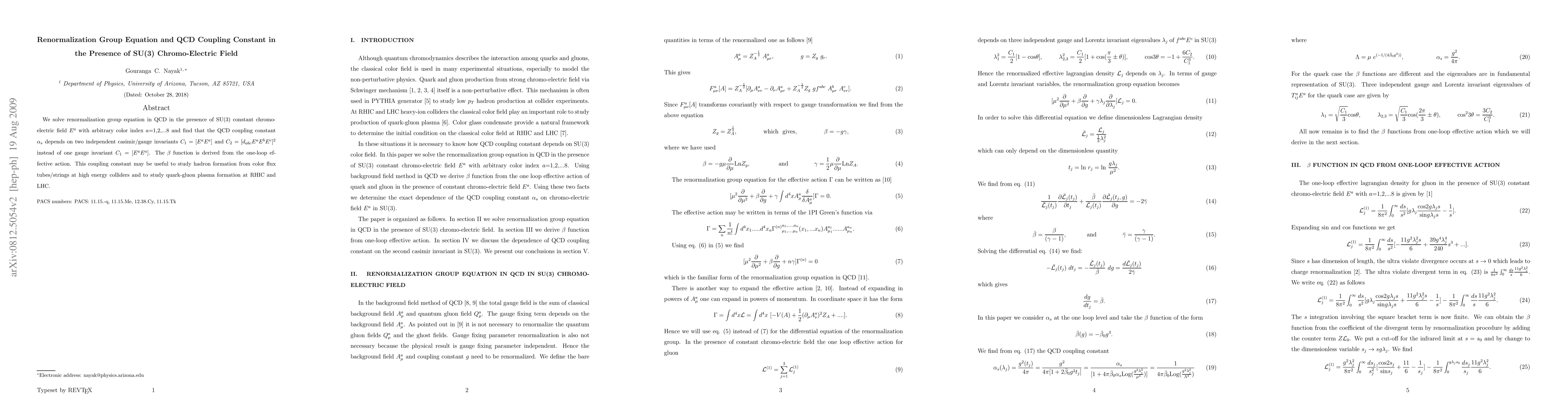 We solve renormalization group equation in QCD in the presence of SU(3) constant chromo-electric field E^a with arbitrary color index a=1,2,...8 and find that the QCD coupling constant \alpha_s depends on two independent casimir/gauge invariants C_1=[E^aE^a] and C_2=[d_{abc}E^aE^bE^c]^2 instead of one gauge invariant C_1=[E^aE^a]. The \beta function is derived from the one-loop effective action. This coupling constant may be useful to study hadron formation from color flux tubes/strings at high energy colliders and to study quark-gluon plasma formation at RHIC and LHC.