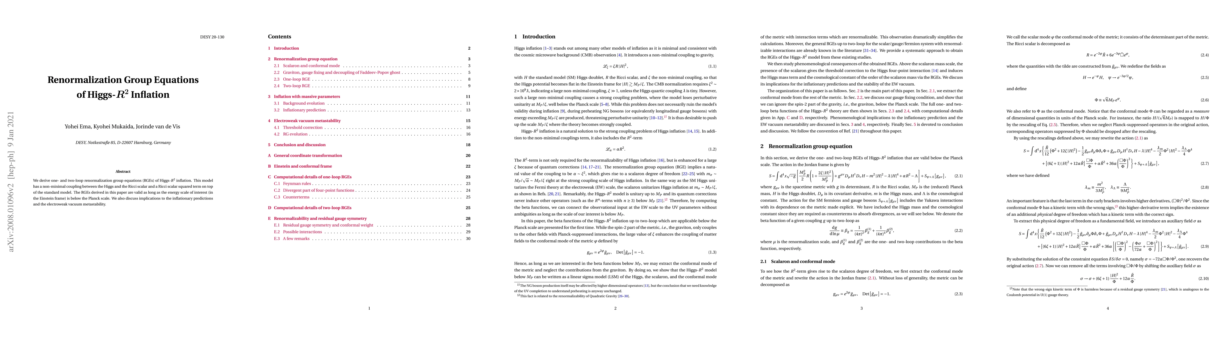 This paper derives one- and two-loop renormalization group equations for Higgs-$R^2$ inflation, a model featuring non-minimal Higgs-Ricci scalar coupling and a Ricci scalar squared term. The derived RGEs apply to energy scales below the Planck scale, with implications for inflationary predictions and electroweak vacuum stability.