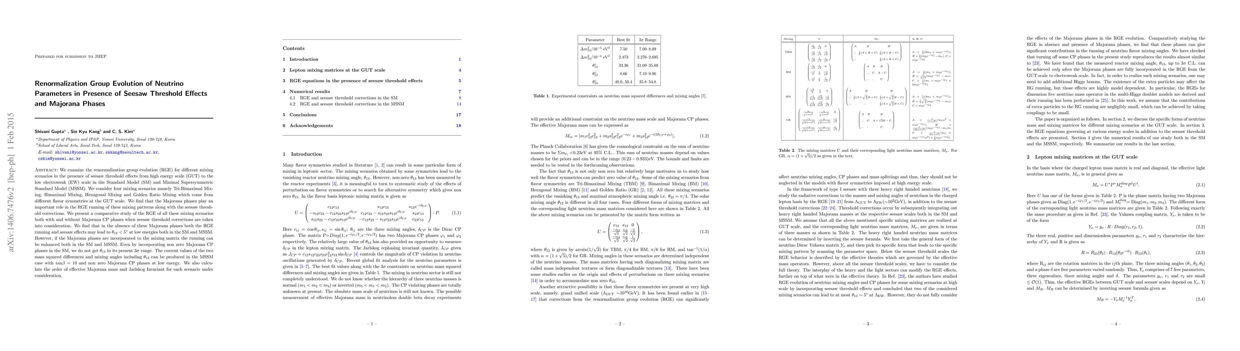 This paper investigates the renormalization group evolution of neutrino mixing parameters under seesaw threshold effects and Majorana phases from GUT to EW scales in both SM and MSSM. It finds that Majorana phases significantly influence the evolution of different mixing patterns, with the MSSM case potentially accommodating current neutrino mixing values when non-zero Majorana CP phases are included.