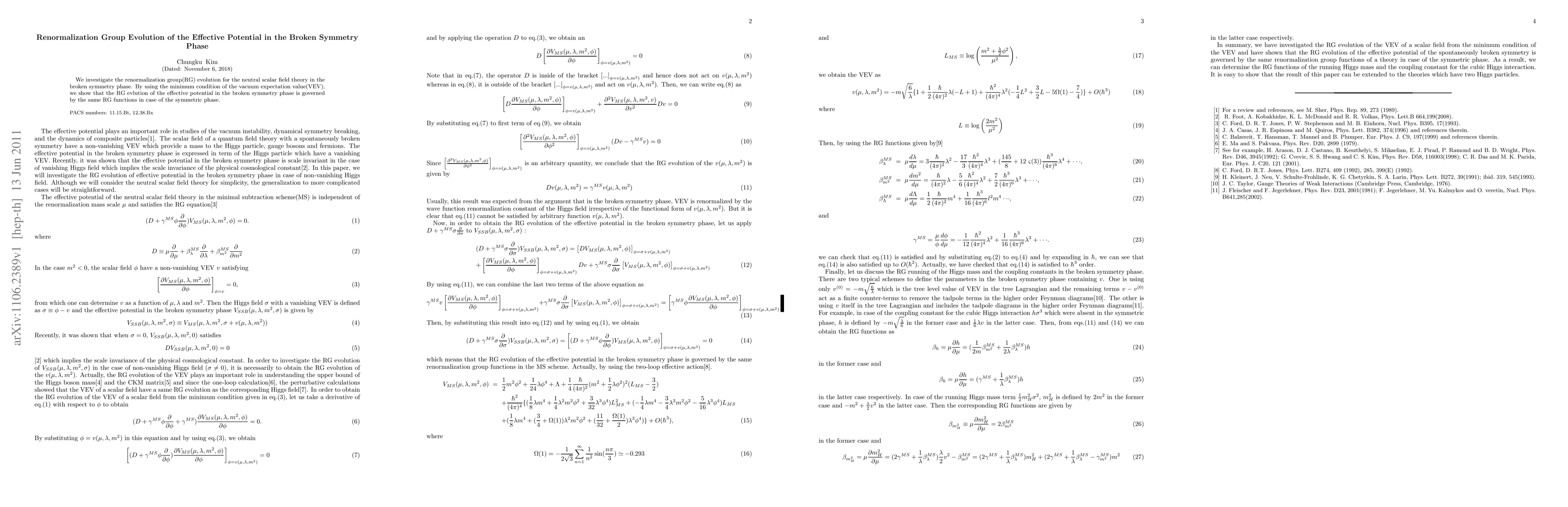Summary: This paper examines the renormalization group evolution of the effective potential in a broken symmetry phase for neutral scalar field theory, demonstrating that the RG evolution follows the same RG functions as in the symmetric phase, using the minimum condition of the vacuum expectation value.