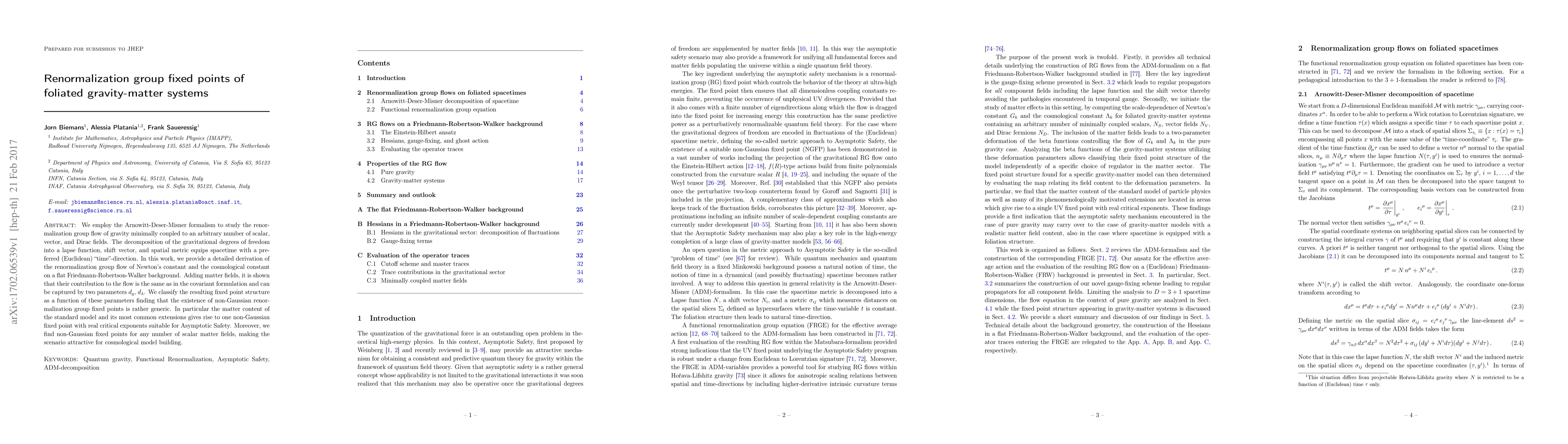 This paper studies the renormalization group flow of foliated gravity-matter systems using the Arnowitt-Deser-Misner formalism, deriving the flow of Newton's constant and cosmological constant on a flat background. It finds non-Gaussian fixed points generic and identifies a non-Gaussian fixed point suitable for Asymptotic Safety in the standard model and its extensions.