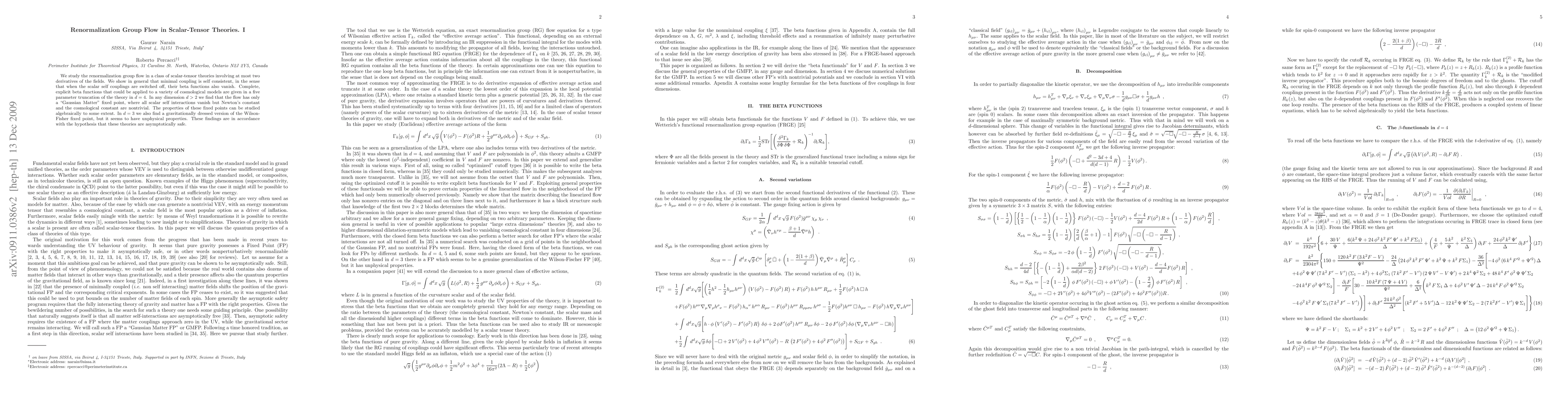 We study the renormalization group flow in a class of scalar-tensor theories involving at most two derivatives of the fields. We show in general that minimal coupling is self consistent, in the sense that when the scalar self couplings are switched off, their beta functions also vanish. Complete, explicit beta functions that could be applied to a variety of cosmological models are given in a five parameter truncation of the theory in $d=4$. In any dimension $d>2$ we find that the flow has only a "Gaussian Matter" fixed point, where all scalar self interactions vanish but Newton's constant and the cosmological constant are nontrivial. The properties of these fixed points can be studied algebraically to some extent. In $d=3$ we also find a gravitationally dressed version of the Wilson-Fisher fixed point, but it seems to have unphysical properties. These findings are in accordance with the hypothesis that these theories are asymptotically safe.