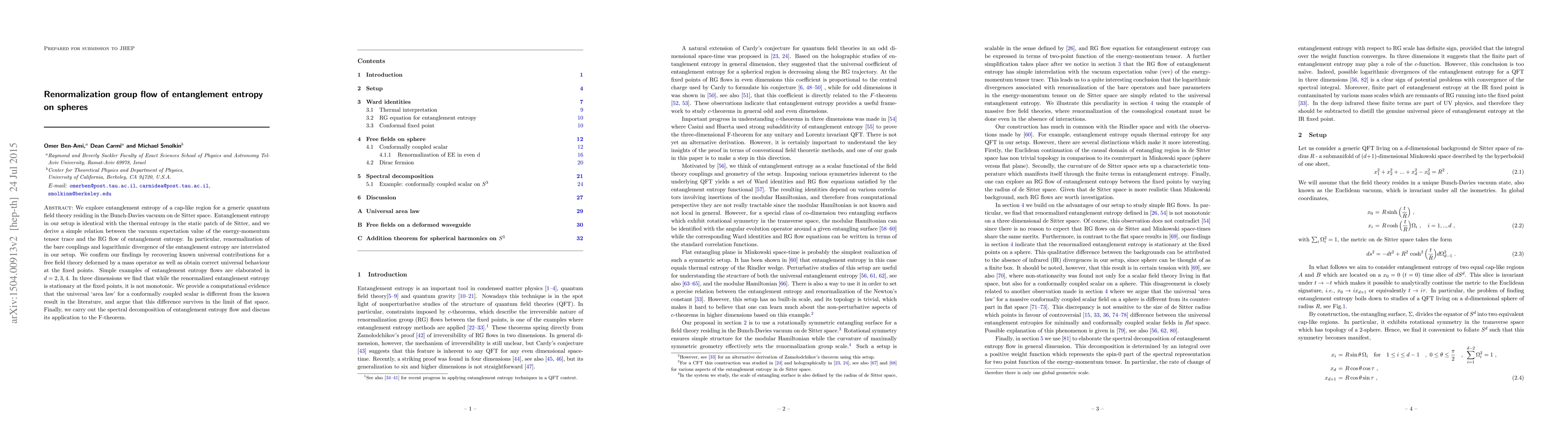 We explore entanglement entropy of a cap-like region for a generic quantum field theory residing in the Bunch-Davies vacuum on de Sitter space. Entanglement entropy in our setup is identical with the thermal entropy in the static patch of de Sitter, and we derive a simple relation between the vacuum expectation value of the energy-momentum tensor trace and the RG flow of entanglement entropy. In particular, renormalization of the cosmological constant and logarithmic divergence of the entanglement entropy are interrelated in our setup. We confirm our findings by recovering known universal contributions for a free field theory deformed by a mass operator as well as obtain correct universal behaviour at the fixed points. Simple examples of entanglement entropy flows are elaborated in $d=2,3,4$. In three dimensions we find that while the renormalized entanglement entropy is stationary at the fixed points, it is not monotonic. We provide a computational evidence that the universal `area law' for a conformally coupled scalar is different from the known result in the literature, and argue that this difference survives in the limit of flat space. Finally, we carry out the spectral decomposition of entanglement entropy flow and discuss its application to the F-theorem.