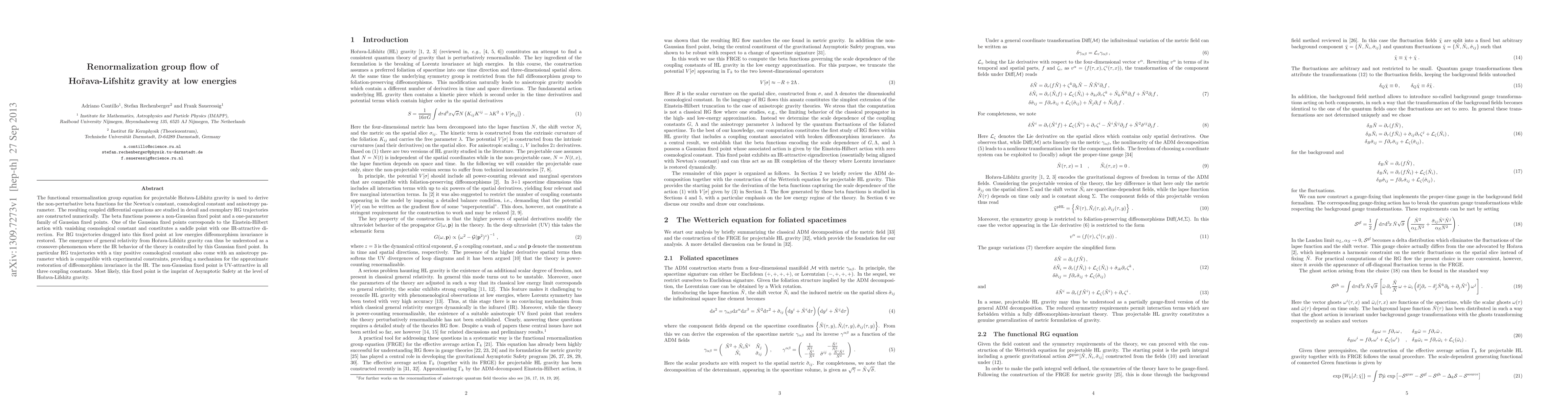 Researchers used functional renormalization group to study Hoñrava-Lifshitz gravity at low energies, finding a non-Gaussian fixed point that can restore diffeomorphism invariance and a Gaussian fixed point corresponding to Einstein-Hilbert action with vanishing cosmological constant.