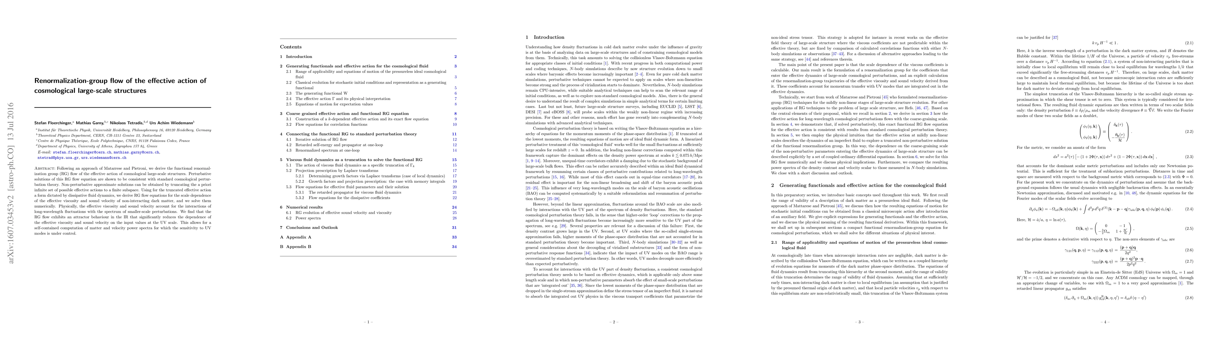 Following an approach of Matarrese and Pietroni, we derive the functional renormalization group (RG) flow of the effective action of cosmological large-scale structures. Perturbative solutions of this RG flow equation are shown to be consistent with standard cosmological perturbation theory. Non-perturbative approximate solutions can be obtained by truncating the a priori infinite set of possible effective actions to a finite subspace. Using for the truncated effective action a form dictated by dissipative fluid dynamics, we derive RG flow equations for the scale dependence of the effective viscosity and sound velocity of non-interacting dark matter, and we solve them numerically. Physically, the effective viscosity and sound velocity account for the interactions of long-wavelength fluctuations with the spectrum of smaller-scale perturbations. We find that the RG flow exhibits an attractor behaviour in the IR that significantly reduces the dependence of the effective viscosity and sound velocity on the input values at the UV scale. This allows for a self-contained computation of matter and velocity power spectra for which the sensitivity to UV modes is under control.
