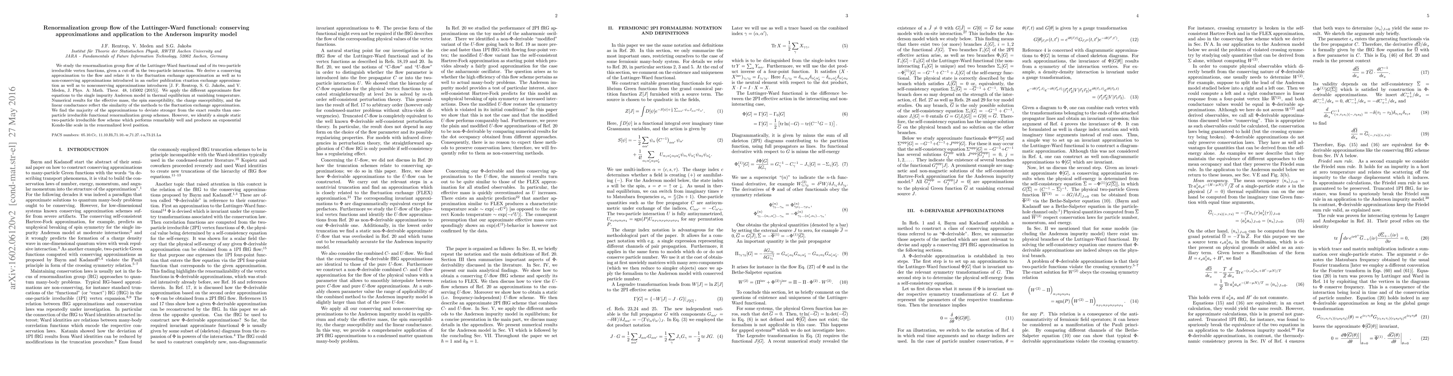 This paper explores the renormalization group flow of the Luttinger-Ward functional, deriving a conserving approximation and comparing it to fluctuation exchange and non-conserving approximations. The method is applied to the Anderson impurity model, showing promising results for effective mass and susceptibility, though generally deviating more from exact results than one-particle schemes.