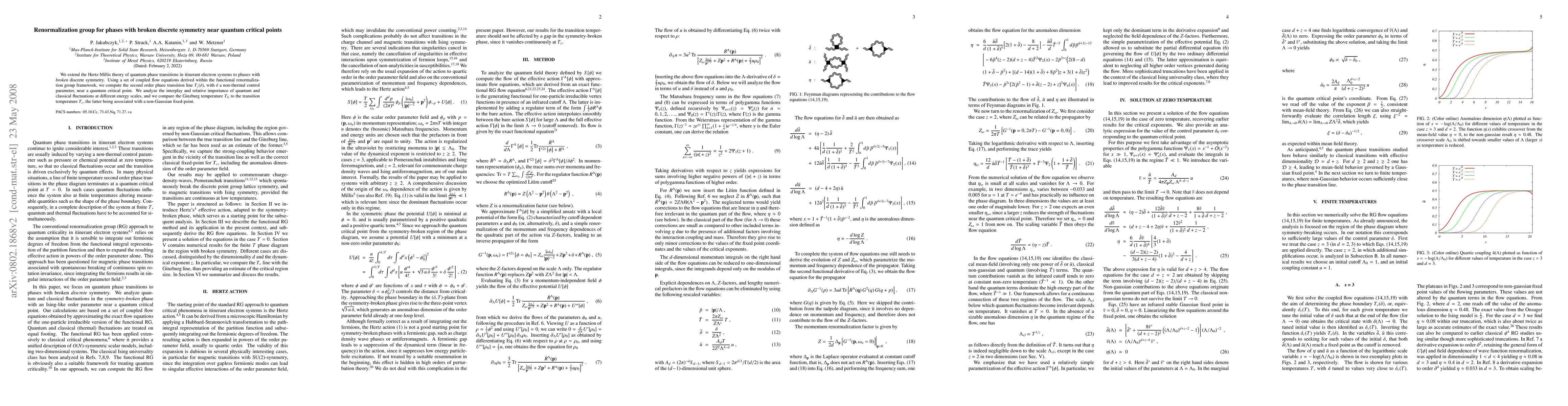 This paper extends Hertz-Millis theory to phases with broken discrete symmetry, employing functional renormalization group methods to derive coupled flow equations. It investigates the second-order phase transition line near quantum critical points, comparing Ginzburg temperature with transition temperature linked to a non-Gaussian fixed point.