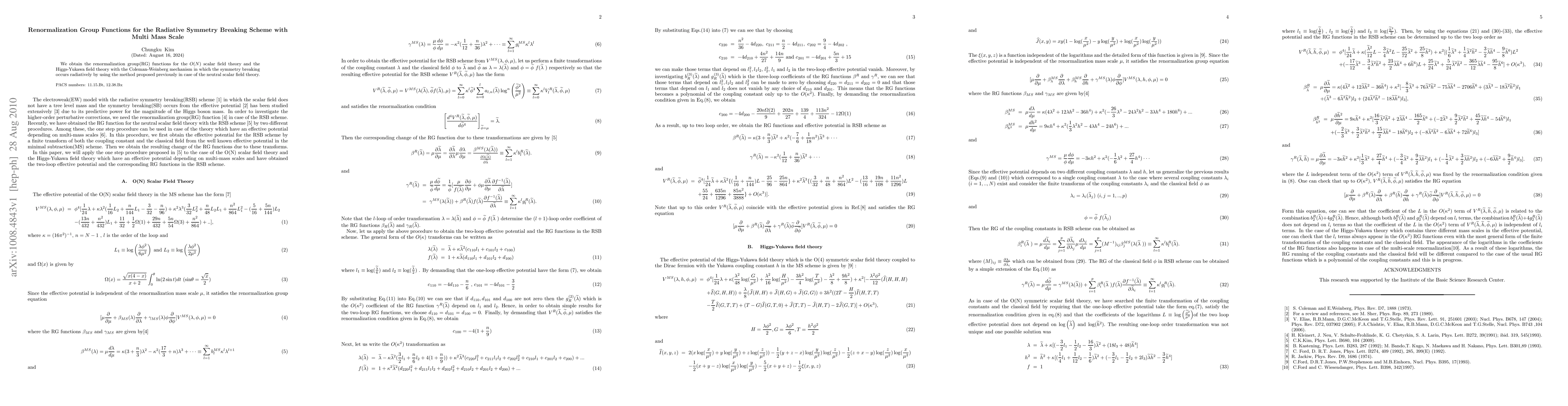 Summary: This paper derives the renormalization group functions for the $O(N)$ scalar field theory and Higgs-Yukawa field theory, focusing on radiative symmetry breaking through the Coleman-Weinberg mechanism, utilizing a previously established method for neutral scalar field theory.