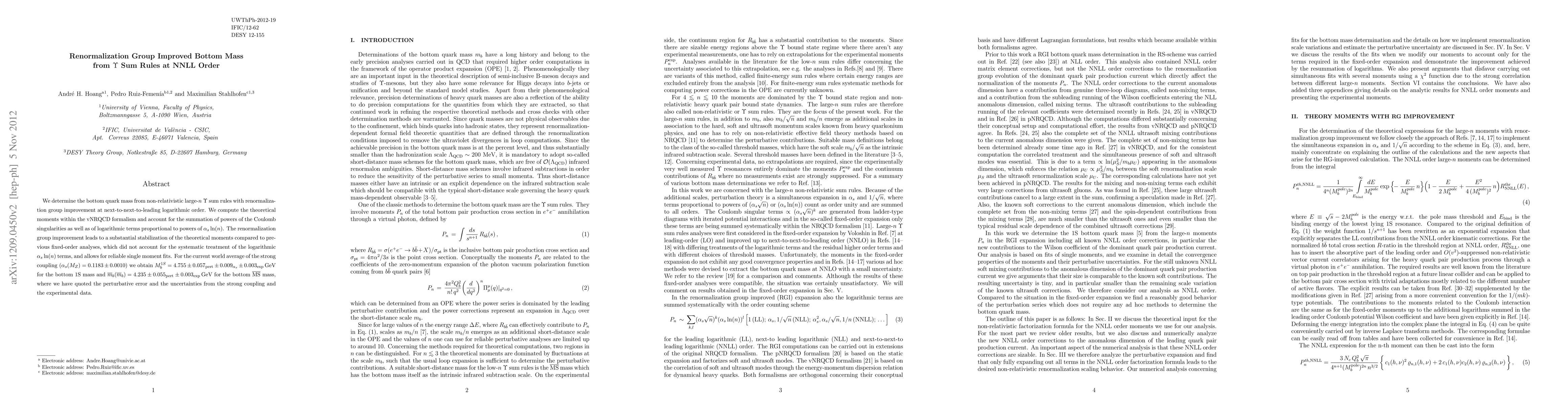 This paper determines the bottom quark mass using Upsilon sum rules with renormalization group improvement at next-to-next-to-leading logarithmic order, yielding more stable theoretical moments and precise values: M_b^{1S}=4.755 ± 0.057(pert) ± 0.009(alpha_s) ± 0.003(exp) GeV and m_b(m_b)=4.235 ± 0.055(pert) ± 0.003(exp) GeV.