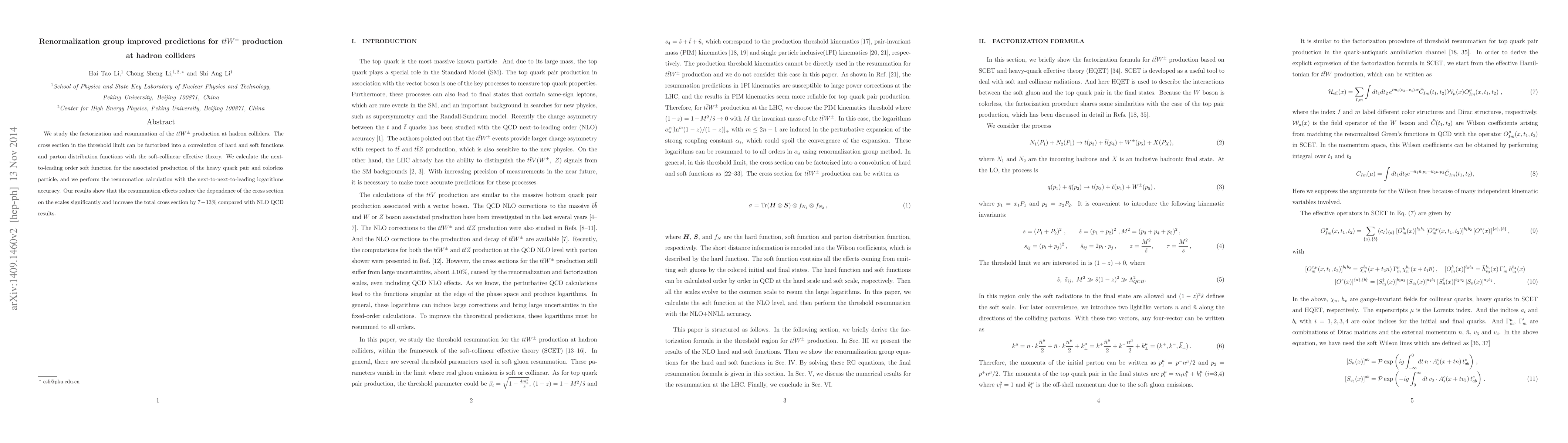 This paper investigates the factorization and resummation of $t\bar{t}W^\pm$ production at hadron colliders, calculating the next-to-leading order soft function and performing next-to-next-to-leading logarithms resummation. The results indicate a $7-13\%$ increase in the total cross section due to resummation effects.