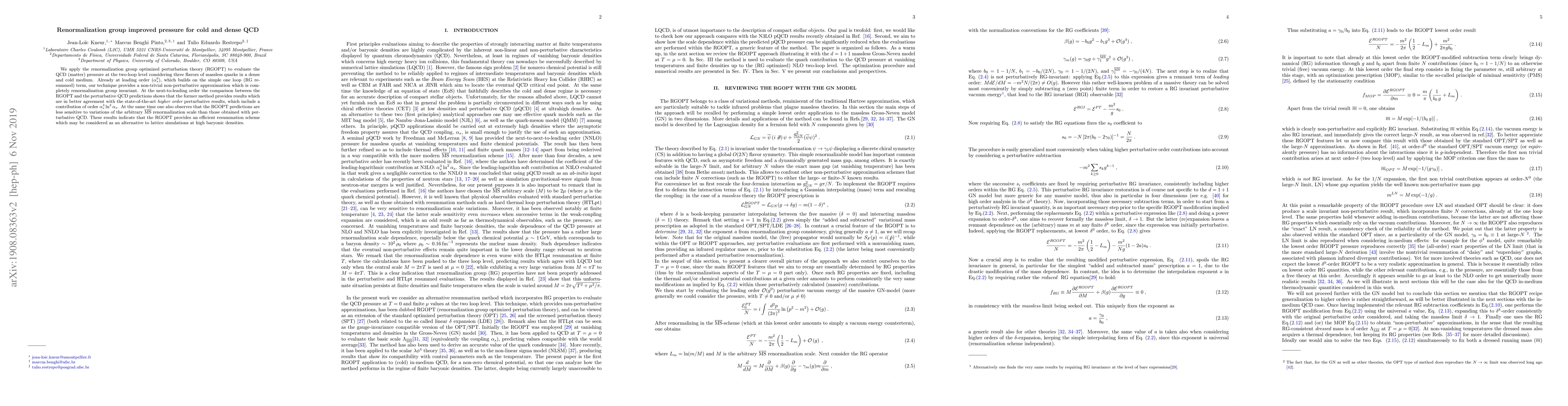 This paper evaluates the pressure in cold, dense QCD using renormalization group optimized perturbation theory (RGOPT) at two-loop level, showing better agreement with higher-order perturbative results compared to traditional pQCD, and demonstrating reduced sensitivity to renormalization scale variations. RGOPT emerges as an effective alternative to lattice simulations for high baryonic densities.