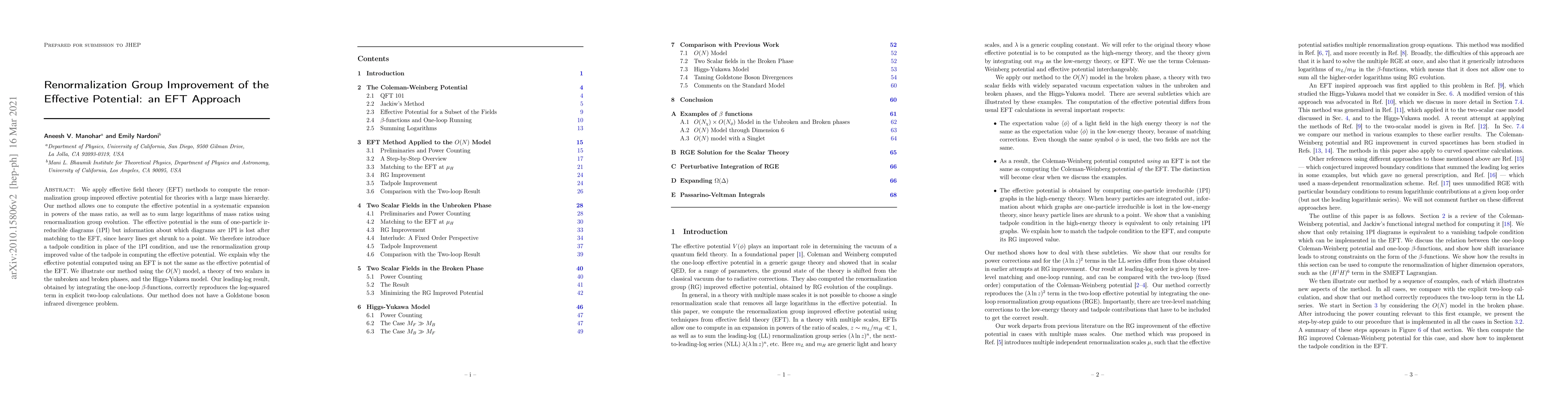 This paper applies effective field theory (EFT) methods to compute the renormalization group improved effective potential for theories with large mass hierarchies, introducing a tadpole condition to address lost information from heavy lines. The method successfully reproduces leading-log results and avoids Goldstone boson infrared divergences.