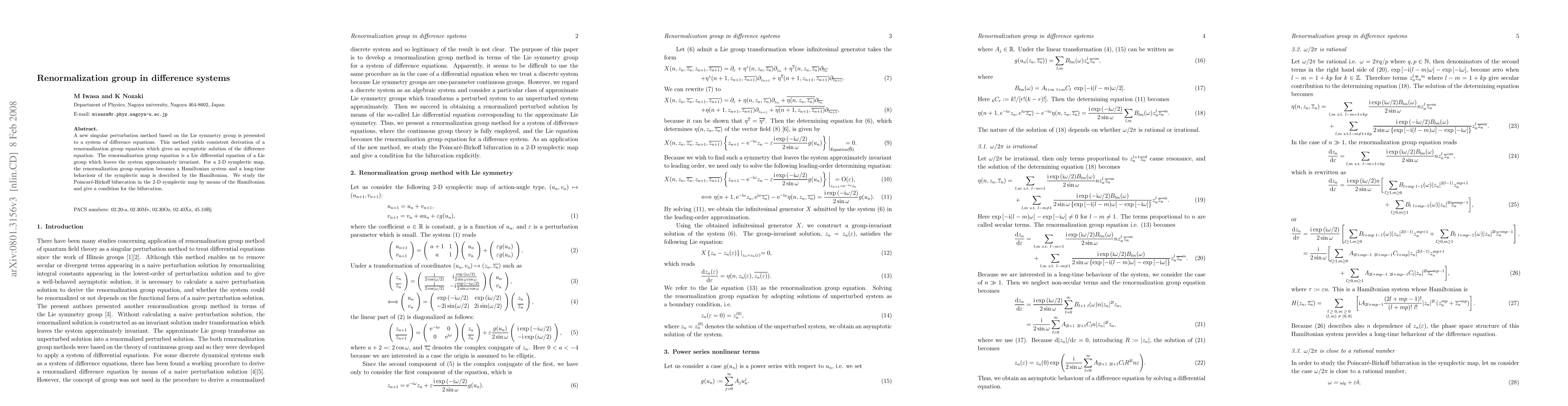 This paper introduces a novel singular perturbation method using Lie symmetry groups to derive a renormalization group equation for difference systems, providing an asymptotic solution. The method is applied to a 2-D symplectic map, where the renormalization group equation is shown to be a Hamiltonian system, enabling the study of Poincaré-Birkhoff bifurcation and providing conditions for it.