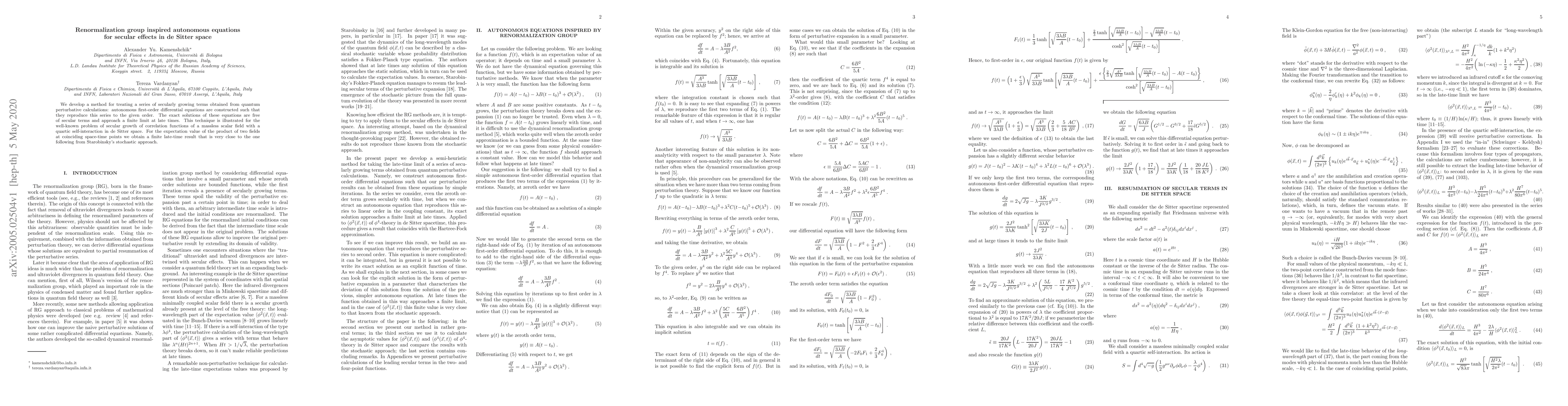 This paper proposes a method using renormalization group-inspired autonomous differential equations to address secular growth in quantum perturbative calculations in de Sitter space, yielding exact solutions that avoid secular terms and converge to a finite value at late times. The technique is applied to the problem of correlation functions for a massless scalar field, achieving results consistent with Starobinsky's stochastic approach.