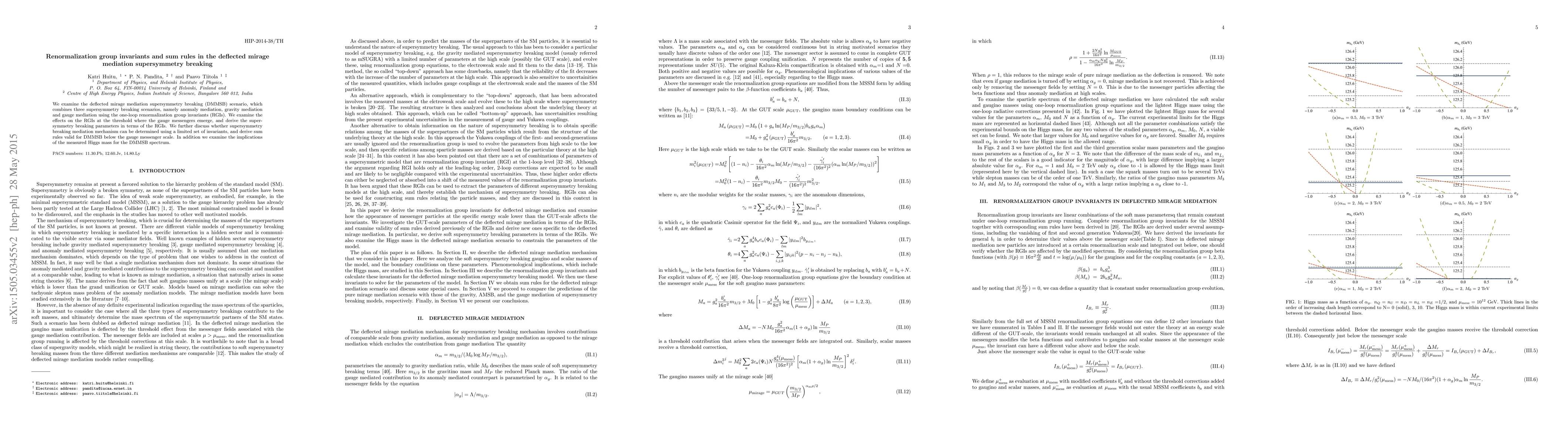 This paper investigates the deflected mirage mediation supersymmetry breaking (DMMSB) scenario, analyzing contributions from anomaly, gravity, and gauge mediation via one-loop renormalization group invariants (RGIs). It derives soft SUSY breaking parameters using RGIs and proposes sum rules for determining the SUSY breaking mechanism, alongside examining implications of the Higgs mass on the DMMSB spectrum.